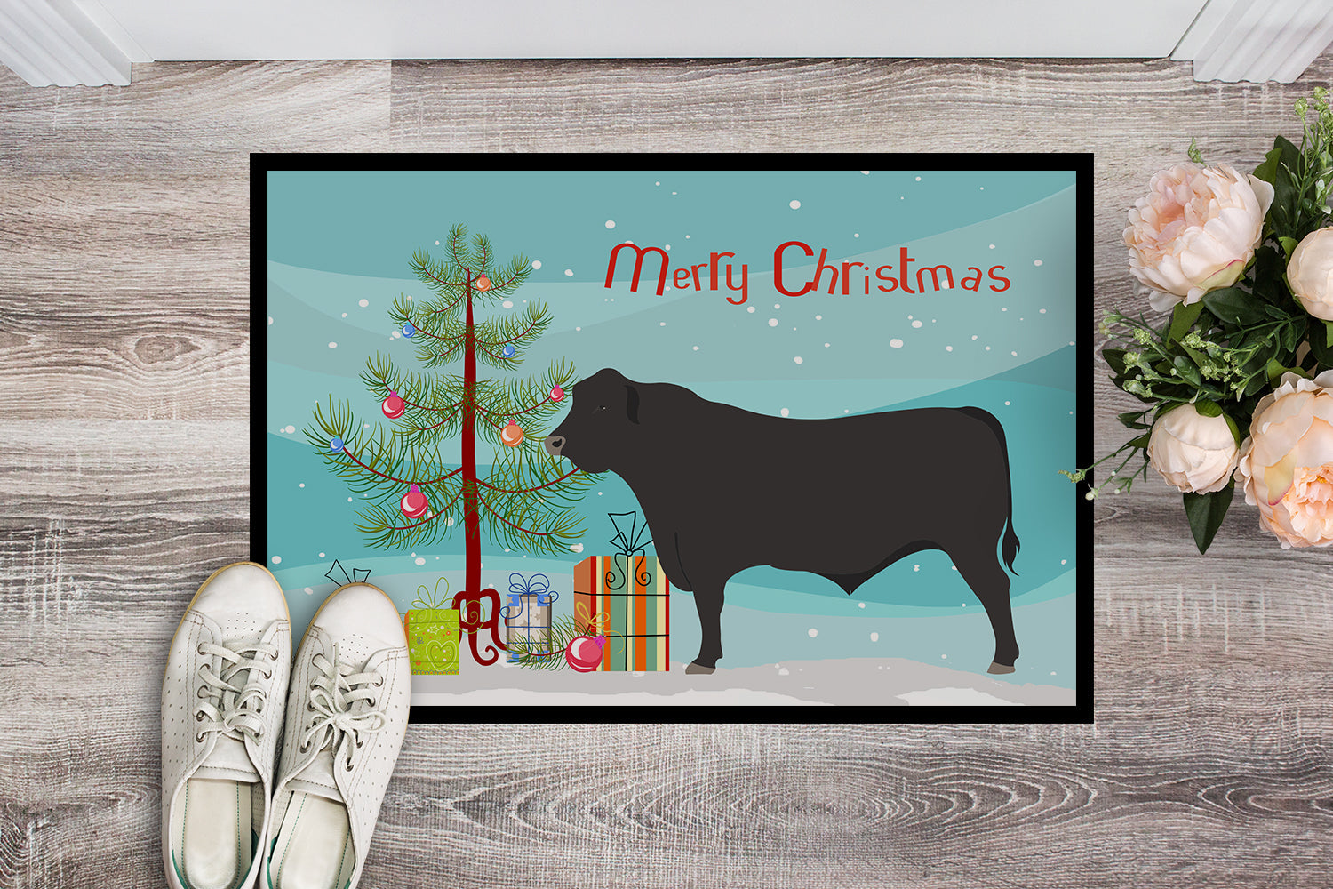 Decorate your space with our Christmas Black Angus Cow artwork on a Doormat. Welcome your guests in style with our Artwork Door Mat, designed to withstand almost any weather condition. This mat, measuring approximately 18 by 27 inches, is held together by durable black binding tape. Its top layer, composed of polyester felt, is dyed with the eye-catching image you see on the mat. A few layers below provide the mat with stability, while its rubber bottom is stamped to help prevent slipping and ensures safety. Our mat works wonderfully as both an indoor or outdoor door mat. For cleaning, simply hose it off with water or use a power washer - no need for any cleaner that produces suds. Avoid scrubbing with a brush, instead, opt for the vacuum on floor setting. Designed manufactured and printed in the USA, this mat is a perfect addition to your porch, outdoor kitchen, entryway, or any indoor space. Its unique design makes it a charming decorative rug that greets your guests and adds a stylish touch to your home decor.