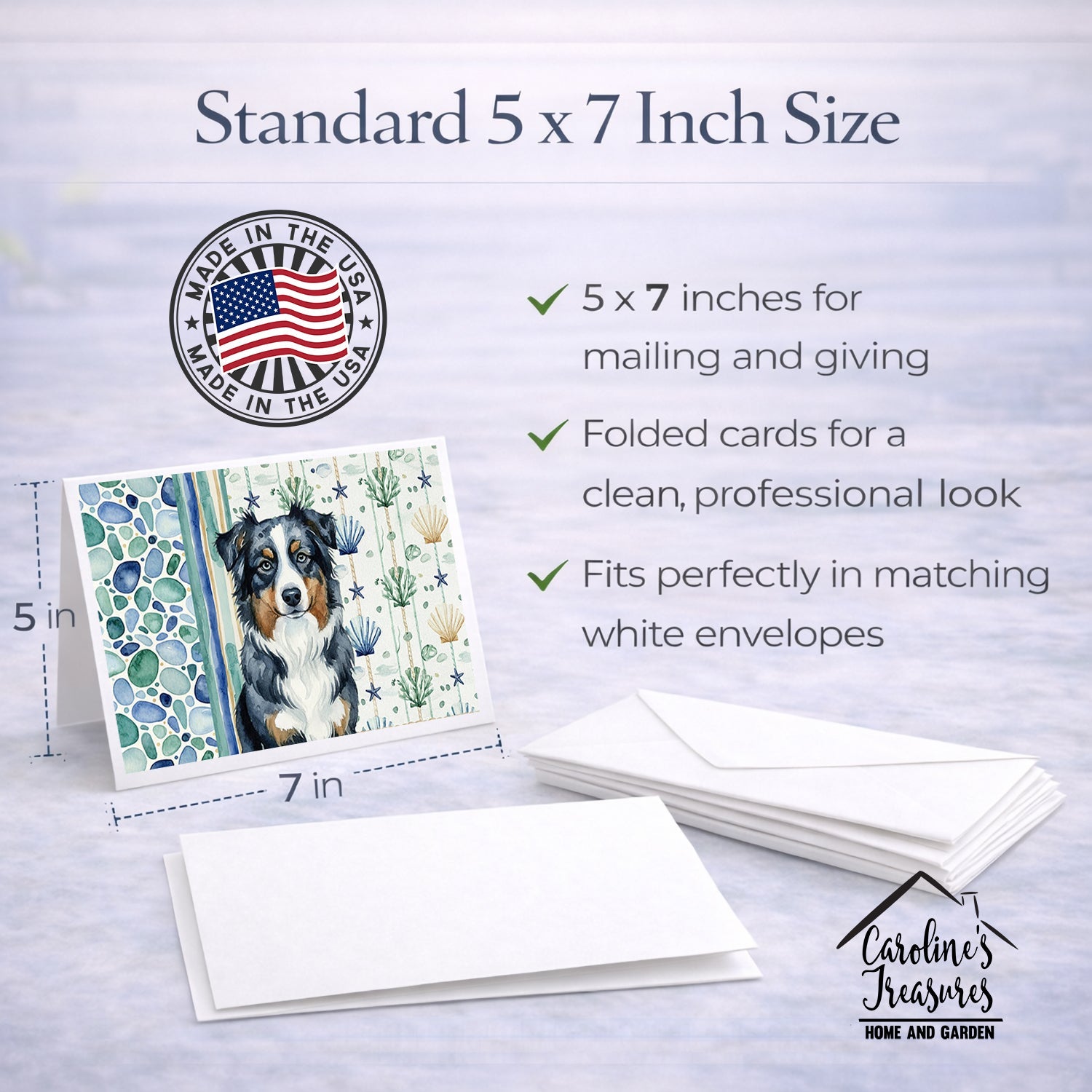 Shown here is the Black Australian Shepherd Coastal Sea Glass Greeting Cards Pack of 8 from Caroline's Treasures featuring artwork of a Australian Shepherd in a Everyday design. The detailed illustration and vibrant colors make it a standout accent that celebrates both seasonal style and love for the subject. This image features a calming coastal watercolor pattern with soft seashells, seaweed, starfish, and pebble-inspired accents arranged in a repeating design. The soothing palette of blues, greens, and sandy neutrals creates a relaxed, beach-inspired look that adds a fresh and tranquil feel to any space. Everyday décor celebrates personal style and the small moments that make a house feel like home. Thoughtful designs add warmth and personality that can be enjoyed year-round. Celebrate special moments with Caroline's Treasures Printed Greeting Card Pack. This pack includes eight beautifully folded 5x7 cards, accompanied by eight matching white envelopes. With blank interiors, these cards provide ample space for your personalized messages and heartfelt holiday greetings. Each card features captivating full-color artwork, meticulously printed in our facility on high-quality 80 lb cover stock or 216 GSM. The super smooth finish of the white cards enhances the visual impact of the artwork, creating a truly stunning presentation. Designed by our talented in-house artists or licensed artists, the artwork on these cards showcases their creativity and attention to detail. From vibrant illustrations to captivating designs, each card tells its own unique story. Whether it's for birthdays, anniversaries, holidays, or any special occasion, Caroline's Treasures Greeting Card Pack is the perfect way to convey your heartfelt sentiments. Share joy, love, and warm wishes with these exquisite cards and make every moment unforgettable. Perfect for: Writing personal messages, everyday correspondence, and thoughtful notes, Dogs-themed stationery collections, or year-round use for Australian Shepherd lovers. Australian Shepherds, commonly called Aussies, are highly intelligent, energetic, and loyal dogs. Known for their herding ability and strong bond with owners, this breed is especially loved by active households. Makes a heartfelt gift for: Australian Shepherd owners, Dogs lovers, Everyday gifts, pet parents, friends who adore their Australian Shepherd, or anyone celebrating Dogs.