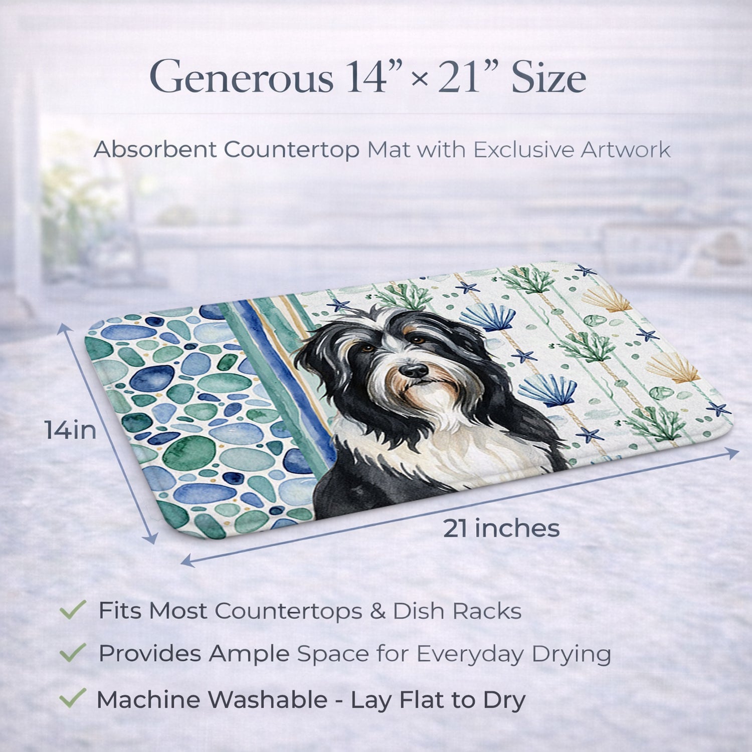 Shown here is the Black Bearded Collie Coastal Sea Glass Dish Drying Mat from Caroline's Treasures featuring artwork of a Bearded Collie in a Everyday design. The detailed illustration and vibrant colors make it a standout accent that celebrates both seasonal style and love for the subject. This image features a calming coastal watercolor pattern with soft seashells, seaweed, starfish, and pebble-inspired accents arranged in a repeating design. The soothing palette of blues, greens, and sandy neutrals creates a relaxed, beach-inspired look that adds a fresh and tranquil feel to any space. Everyday décor celebrates personal style and the small moments that make a house feel like home. Thoughtful designs add warmth and personality that can be enjoyed year-round. Say goodbye to messy countertops and soggy dish towels with our innovative dish drying mat. Our high-quality dish drying pad is designed to keep your countertops dry while offering a stylish and efficient solution. Whether you're air drying dishes, glasses, stemware, silverware, pots, pans, bottles, or even fruits and vegetables, our dish mat is the perfect choice. The 14 inches x 21 inches size fits most counters and dish drying racks, and the non-slip design ensures stability. Made with water-absorbent polyester and a polyurethane foam insert, our dish drying mat is not only functional but also durable. It's machine washable and printed in the USA for long-lasting use. The beautiful artwork adds flair to your kitchen decor, making it a perfect housewarming gift or present for any occasion. Upgrade your kitchen experience with our absorbent and versatile dish drying mat. Perfect for: Kitchen counters and sinks, everyday dish drying and countertop protection, Dogs-themed homes, or year-round use for Bearded Collie lovers. Bearded Collies are energetic herding dogs known for their intelligence and joyful personality. Often called Beardies, this breed is admired for its enthusiasm, loyalty, and strong connection with its family. Makes a heartfelt gift for: Bearded Collie owners, Dogs lovers, Everyday gifts, pet parents, friends who adore their Bearded Collie, or anyone celebrating Dogs.