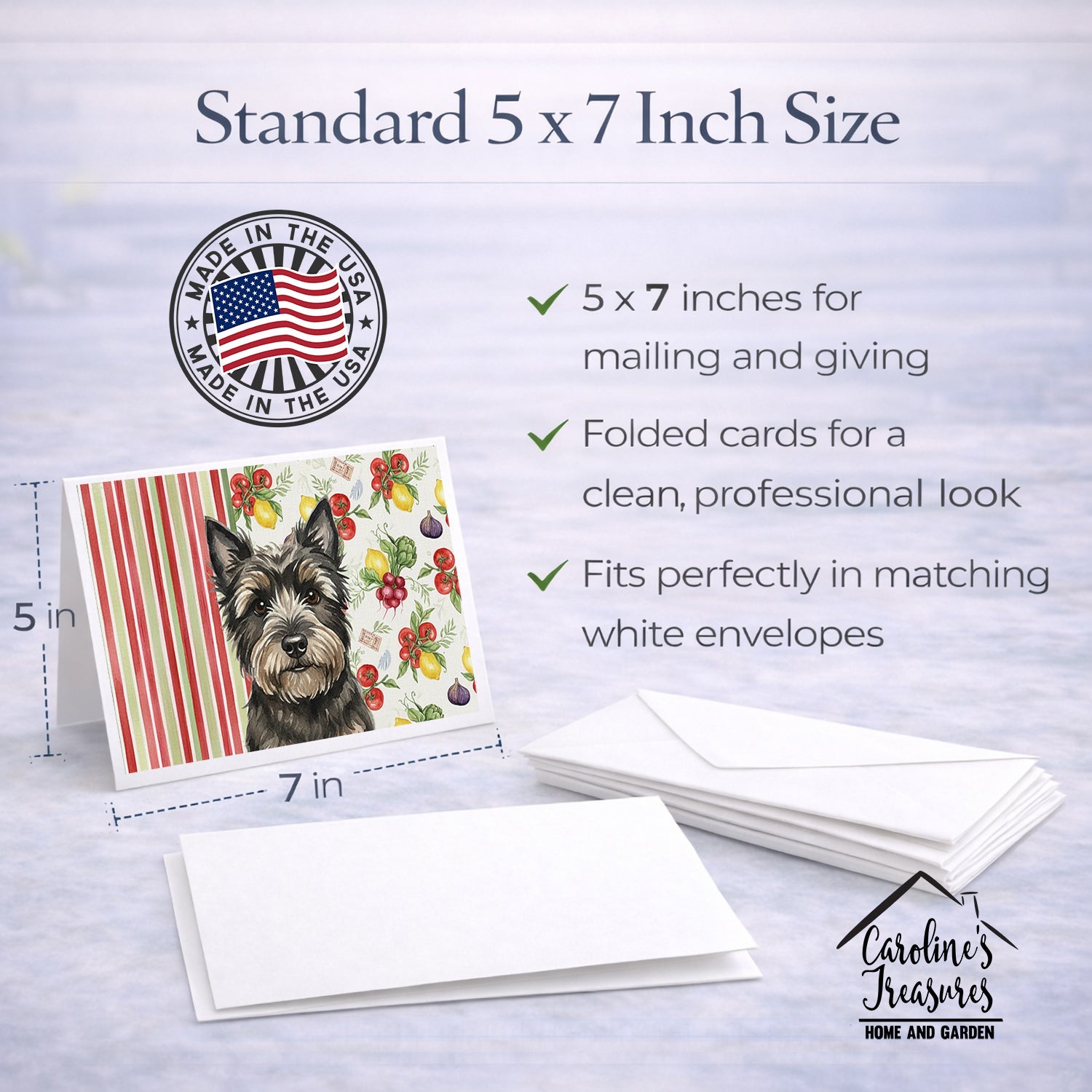 Shown here is the Black Cairn Terrier Vegetables Greeting Cards Pack of 8 from Caroline's Treasures featuring artwork of a Cairn Terrier in a Everyday design. The detailed illustration and vibrant colors make it a standout accent that celebrates both seasonal style and love for the subject. This image features a vibrant watercolor vegetable pattern with tomatoes, lemons, artichokes, figs, radishes, and leafy greens arranged in a repeating design, paired with classic red and green stripes. The bright, garden-fresh palette creates a cheerful, farmhouse-inspired look that feels lively, welcoming, and perfect for kitchen décor. Everyday décor celebrates personal style and the small moments that make a house feel like home. Thoughtful designs add warmth and personality that can be enjoyed year-round. Celebrate special moments with Caroline's Treasures Printed Greeting Card Pack. This pack includes eight beautifully folded 5x7 cards, accompanied by eight matching white envelopes. With blank interiors, these cards provide ample space for your personalized messages and heartfelt holiday greetings. Each card features captivating full-color artwork, meticulously printed in our facility on high-quality 80 lb cover stock or 216 GSM. The super smooth finish of the white cards enhances the visual impact of the artwork, creating a truly stunning presentation. Designed by our talented in-house artists or licensed artists, the artwork on these cards showcases their creativity and attention to detail. From vibrant illustrations to captivating designs, each card tells its own unique story. Whether it's for birthdays, anniversaries, holidays, or any special occasion, Caroline's Treasures Greeting Card Pack is the perfect way to convey your heartfelt sentiments. Share joy, love, and warm wishes with these exquisite cards and make every moment unforgettable. Perfect for: Writing personal messages, everyday correspondence, and thoughtful notes, Dogs-themed stationery collections, or year-round use for Cairn Terrier lovers. Cairn Terriers are small, confident dogs known for their alert expression and spirited personality. This hardy terrier breed is admired for its courage, intelligence, and affectionate loyalty. Makes a heartfelt gift for: Cairn Terrier owners, Dogs lovers, Everyday gifts, pet parents, friends who adore their Cairn Terrier, or anyone celebrating Dogs.