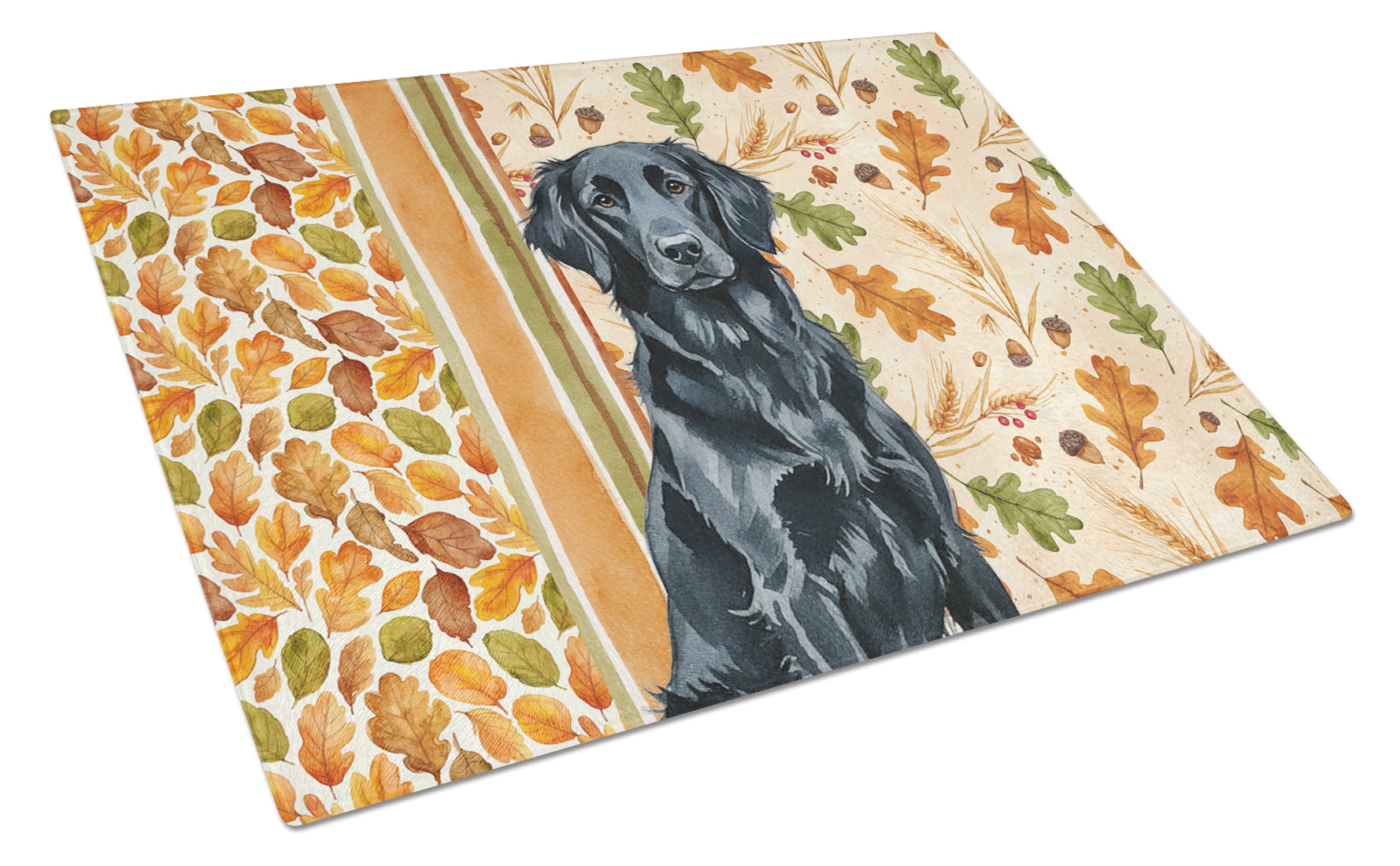 Glass Cutting Board featuring breed specific Flat-Coated Retriever artwork. Celebrate Thanksgiving with this Thanksgiving Cutting Board. Introduce your kitchen to the vibrant, large Decorative Glass Cutting Board from Caroline's Treasures. Crafted from resilient tempered glass, this board is not only a utilitarian necessity but also a colorful art piece. With its generous dimensions of 15 inches in height and 12 inches in length, it offers ample space for all your cutting needs. Every piece showcases captivating artwork from distinguished artists, bringing an aesthetic edge to your kitchen. Beyond its attractive design, this cutting board ensures your countertop stays pristine and unscathed, owing to its heat-resistant properties. Engineered with user convenience in mind, it features non-skid feet for stability, and rounded corners for additional safety. Its robust construction renders it virtually unbreakable, guaranteeing longevity. The board comes with protective feet bumpers, maintaining its position during use. This product is recommended to be hand washed only. Proudly printed and assembled in the United States, this cutting board exemplifies superior craftsmanship. With Caroline's Treasures' Decorative Glass Cutting Board, you're investing in a blend of functionality and artistic flair.