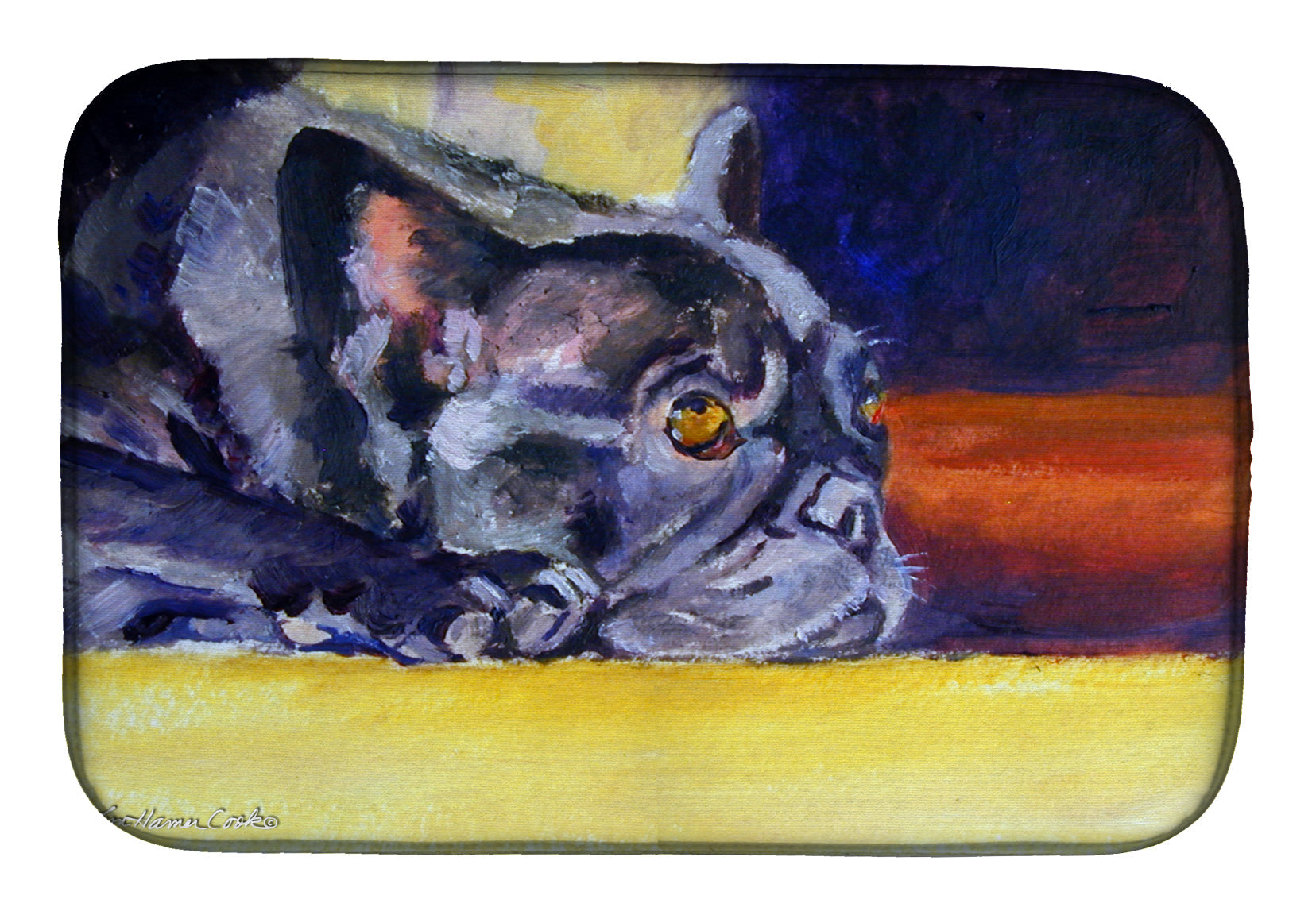 Decorate your space with our French Bulldog artwork on a Dish Drying Mat. Say goodbye to messy countertops and soggy dish towels with our innovative dish drying mat. Our high-quality dish drying pad is designed to keep your countertops dry while offering a stylish and efficient solution. Whether you're air drying dishes, glasses, stemware, silverware, pots, pans, bottles, or even fruits and vegetables, our dish mat is the perfect choice. The 14 inches x 22 inches size fits most counters and dish drying racks, and the non-slip design ensures stability. Made with water-absorbent polyester and a polyurethane foam insert, our dish drying mat is not only functional but also durable. It's machine washable and printed in the USA for long-lasting use. The beautiful artwork adds flair to your kitchen decor, making it a perfect housewarming gift or present for any occasion. Upgrade your kitchen experience with our absorbent and versatile dish drying mat.