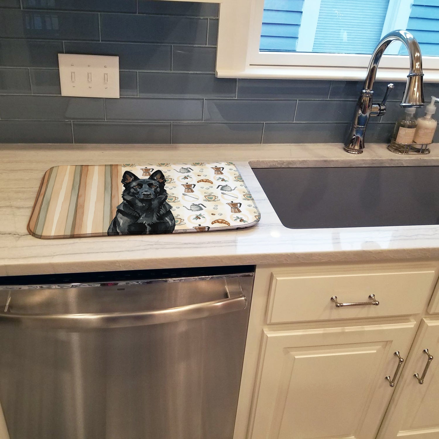 Shown here is the Black German Shepherd Coffee Bar Dish Drying Mat from Caroline's Treasures featuring artwork of a German Shepherd in a Everyday design. The detailed illustration and vibrant colors make it a standout accent that celebrates both seasonal style and love for the subject. This image features a cozy watercolor coffee-themed pattern with illustrated mugs, moka pots, kettles, croissants, coffee beans, and sugar cubes arranged in a repeating design. Soft neutral tones with warm browns, creams, and subtle sage accents create an inviting, café-inspired look that feels comforting and relaxed. Everyday décor celebrates personal style and the small moments that make a house feel like home. Thoughtful designs add warmth and personality that can be enjoyed year-round. Say goodbye to messy countertops and soggy dish towels with our innovative dish drying mat. Our high-quality dish drying pad is designed to keep your countertops dry while offering a stylish and efficient solution. Whether you're air drying dishes, glasses, stemware, silverware, pots, pans, bottles, or even fruits and vegetables, our dish mat is the perfect choice. The 14 inches x 21 inches size fits most counters and dish drying racks, and the non-slip design ensures stability. Made with water-absorbent polyester and a polyurethane foam insert, our dish drying mat is not only functional but also durable. It's machine washable and printed in the USA for long-lasting use. The beautiful artwork adds flair to your kitchen decor, making it a perfect housewarming gift or present for any occasion. Upgrade your kitchen experience with our absorbent and versatile dish drying mat. Perfect for: Kitchen counters and sinks, everyday dish drying and countertop protection, Dogs-themed homes, or year-round use for German Shepherd lovers. German Shepherds are intelligent working dogs known for their loyalty and versatility. This highly respected breed is valued for its trainability, courage, and strong bond with family. Makes a heartfelt gift for: German Shepherd owners, Dogs lovers, Everyday gifts, pet parents, friends who adore their German Shepherd, or anyone celebrating Dogs.