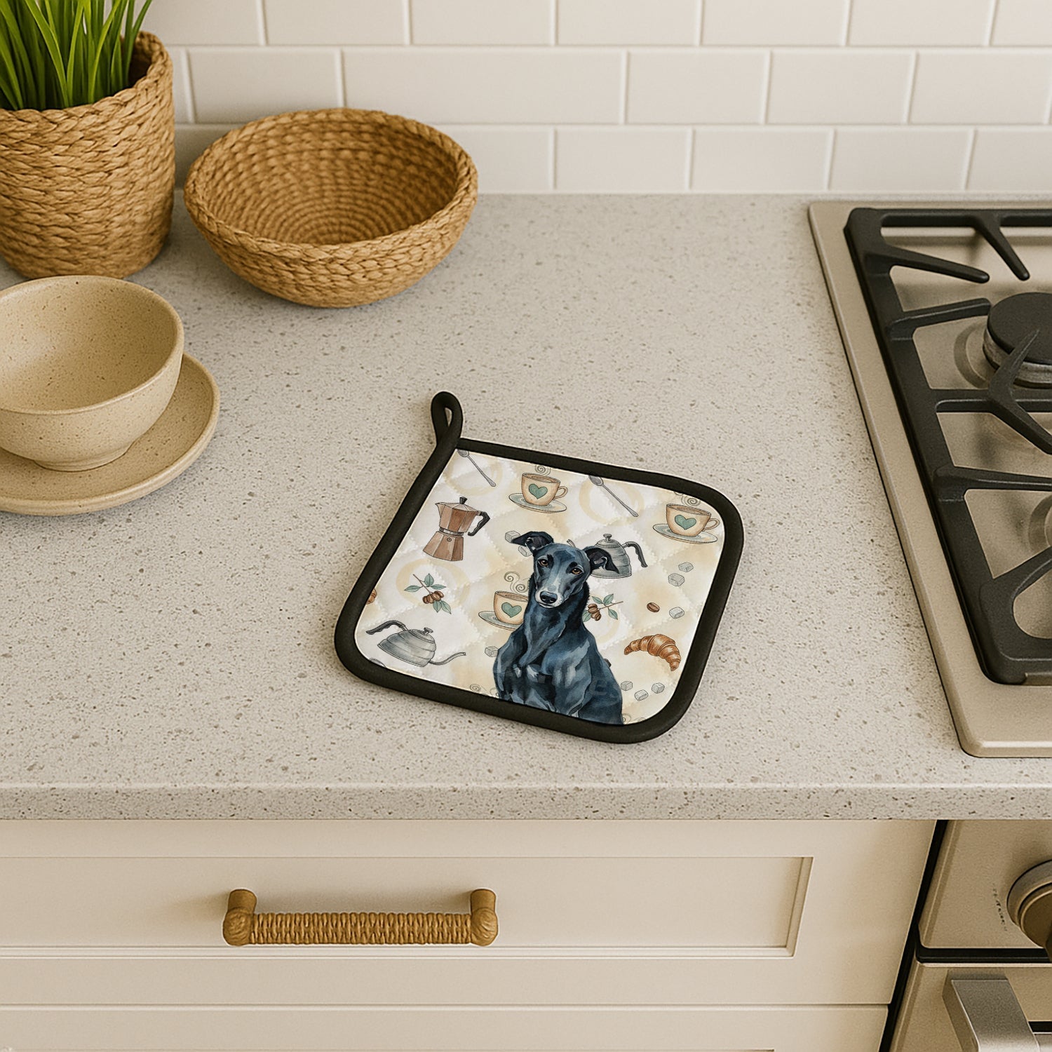 Pair of Pot Holders featuring breed specific Greyhound artwork. Add warmth, personality, and function to your kitchen with our Coffee Time Pot Holder Pair. Each set includes two quilted hot pads, featuring original full-color watercolor artwork on a soft polyester front accented by black trim. Crafted with multiple layers for performance: Top Layer: Vibrant artwork permanently dyed into polyester fabric. Middle Layer: US-manufactured insulated material with breathable polyester fibers and a reflective metalized film that reflects heat back to its source. Bottom Layer: A silver heat-resistant backing for extra protection. Each pot holder measures 7.5" x 7.5", includes a hanging tab, and is quilted for durability. Use them to protect your hands, countertops, and tabletops — or as decorative trivets for Thanksgiving, Christmas, or everyday meals.