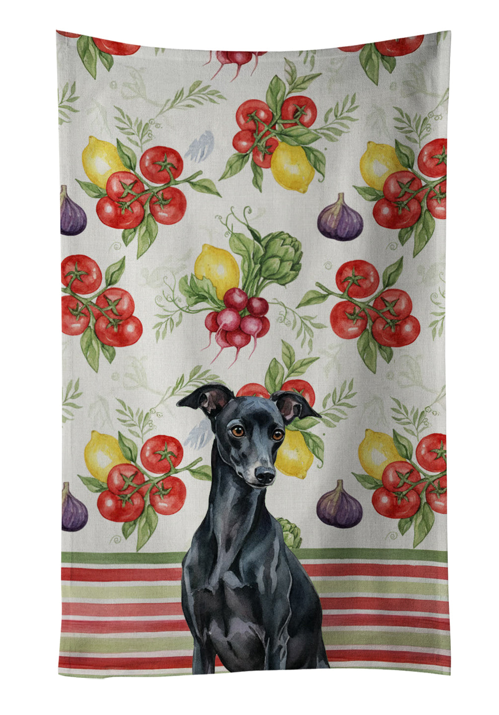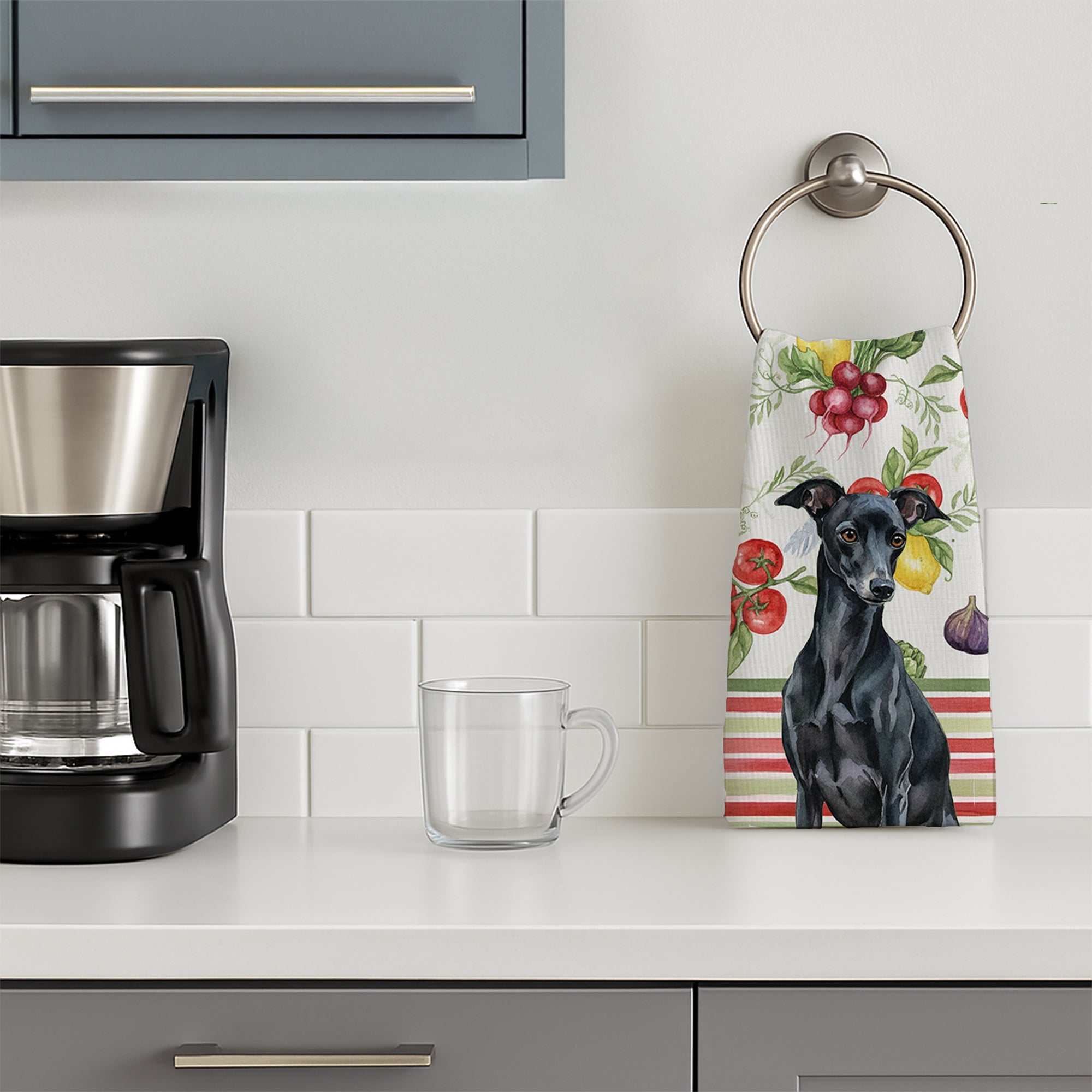 Kitchen Towel featuring breed specific Italian Greyhound artwork. Bring cozy everyday charm to your sink or powder room with a plush velour towel featuring original watercolor artwork. The front is a soft, color-rich minky polyester that polishes glassware to a brilliant shine; the back is 100% white cotton terry loop for quick absorbency on hands, dishes, and counters. Artwork is dyed into the fibers for lasting color that won’t crack or peel. Finished edges keep the shape wash after wash. Size: 15" x 25". Machine wash; tumble dry low. Designed and printed in the USA.