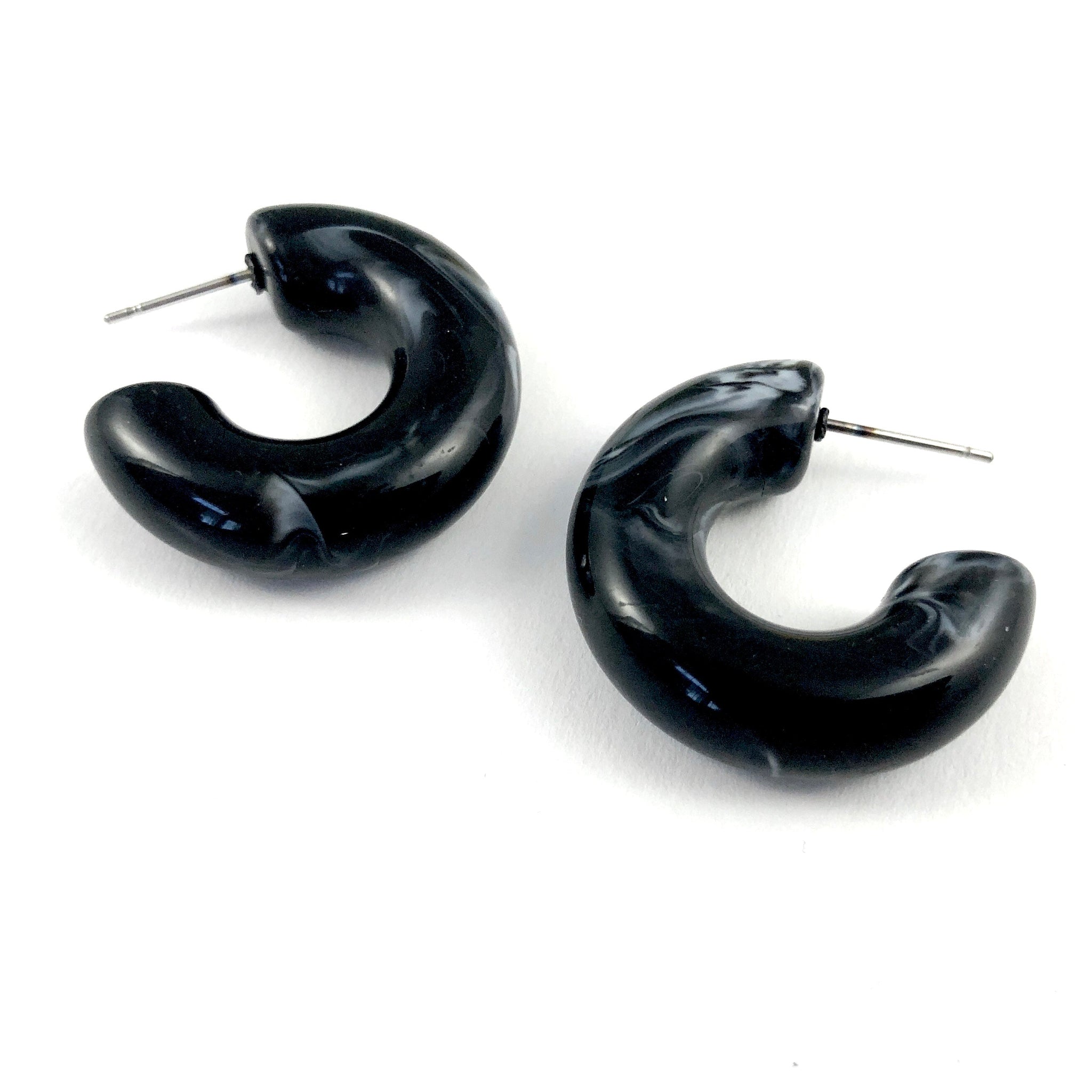 Black marbled chunky tube hoop earrings. This shape & style is known as the 'Polly' Hoop Earring & made with contemporary parts. Each measures just over 1" in diameter and about 8mm thick.