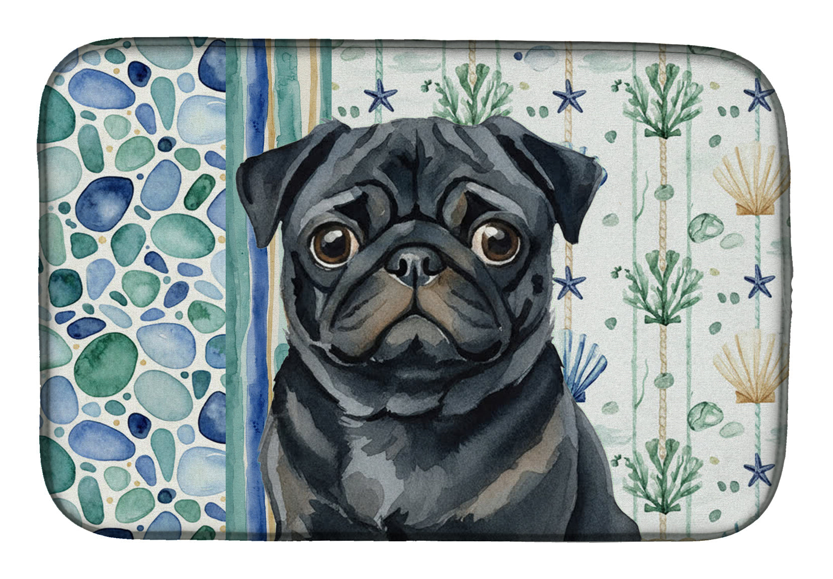 Shown here is the Black Pug Coastal Sea Glass Dish Drying Mat from Caroline's Treasures featuring artwork of a Pug in a Everyday design. The detailed illustration and vibrant colors make it a standout accent that celebrates both seasonal style and love for the subject. This image features a calming coastal watercolor pattern with soft seashells, seaweed, starfish, and pebble-inspired accents arranged in a repeating design. The soothing palette of blues, greens, and sandy neutrals creates a relaxed, beach-inspired look that adds a fresh and tranquil feel to any space. Everyday décor celebrates personal style and the small moments that make a house feel like home. Thoughtful designs add warmth and personality that can be enjoyed year-round. Say goodbye to messy countertops and soggy dish towels with our innovative dish drying mat. Our high-quality dish drying pad is designed to keep your countertops dry while offering a stylish and efficient solution. Whether you're air drying dishes, glasses, stemware, silverware, pots, pans, bottles, or even fruits and vegetables, our dish mat is the perfect choice. The 14 inches x 21 inches size fits most counters and dish drying racks, and the non-slip design ensures stability. Made with water-absorbent polyester and a polyurethane foam insert, our dish drying mat is not only functional but also durable. It's machine washable and printed in the USA for long-lasting use. The beautiful artwork adds flair to your kitchen decor, making it a perfect housewarming gift or present for any occasion. Upgrade your kitchen experience with our absorbent and versatile dish drying mat. Perfect for: Kitchen counters and sinks, everyday dish drying and countertop protection, Dogs-themed homes, or year-round use for Pug lovers. Pugs are charming companion dogs known for their expressive faces and affectionate personality. This breed is loved for its loyalty, playful nature, and strong bond with family. Makes a heartfelt gift for: Pug owners, Dogs lovers, Everyday gifts, pet parents, friends who adore their Pug, or anyone celebrating Dogs.