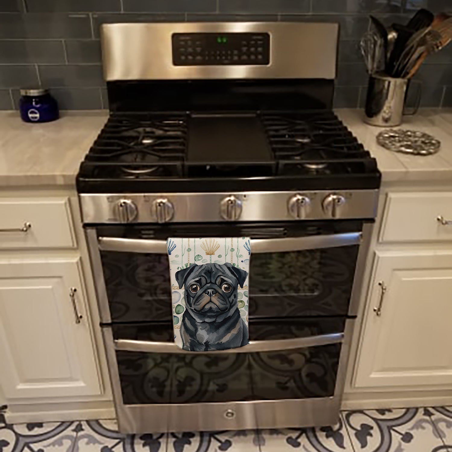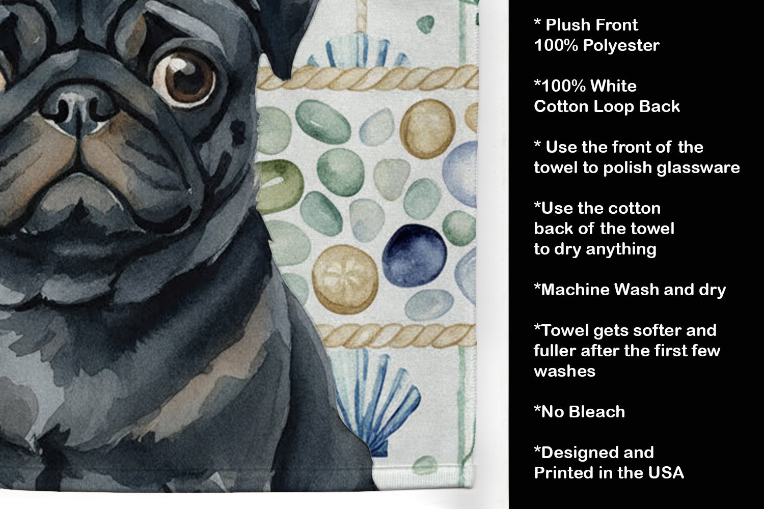 Kitchen Towel featuring breed specific Pug artwork. Bring breezy coastal charm to your kitchen or bath with our plush velour towel featuring original watercolor artwork. The soft minky polyester front showcases vivid seashell and starfish designs with a dog portrait, perfect for polishing glassware to a brilliant shine. The 100% cotton terry loop back delivers superior absorbency for drying hands, dishes, or counters. Artwork is dyed directly into the fibers for lasting color that won’t crack or peel. Each towel measures 15" x 25", with bound edges to maintain shape after repeated washes. Machine washable and tumble dry low for easy care. Designed and printed in the USA, these towels combine function and style—ideal for beach homes, coastal kitchens, or as thoughtful gifts.