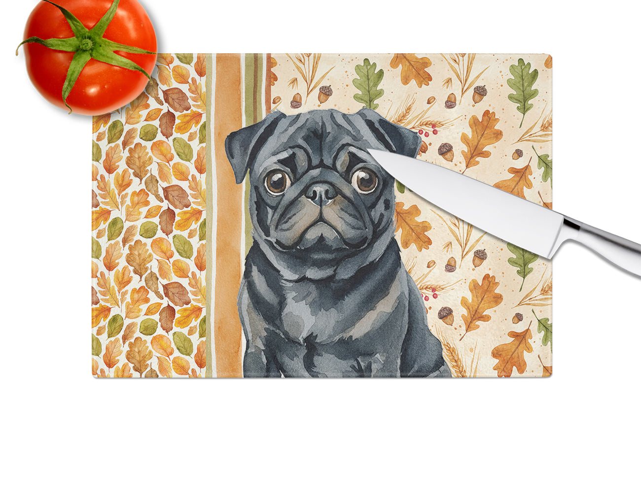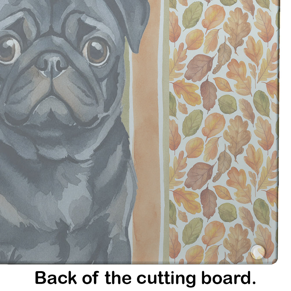 Glass Cutting Board featuring breed specific Pug artwork. Celebrate Thanksgiving with this Thanksgiving Cutting Board. Introduce your kitchen to the vibrant, large Decorative Glass Cutting Board from Caroline's Treasures. Crafted from resilient tempered glass, this board is not only a utilitarian necessity but also a colorful art piece. With its generous dimensions of 15 inches in height and 12 inches in length, it offers ample space for all your cutting needs. Every piece showcases captivating artwork from distinguished artists, bringing an aesthetic edge to your kitchen. Beyond its attractive design, this cutting board ensures your countertop stays pristine and unscathed, owing to its heat-resistant properties. Engineered with user convenience in mind, it features non-skid feet for stability, and rounded corners for additional safety. Its robust construction renders it virtually unbreakable, guaranteeing longevity. The board comes with protective feet bumpers, maintaining its position during use. This product is recommended to be hand washed only. Proudly printed and assembled in the United States, this cutting board exemplifies superior craftsmanship. With Caroline's Treasures' Decorative Glass Cutting Board, you're investing in a blend of functionality and artistic flair.