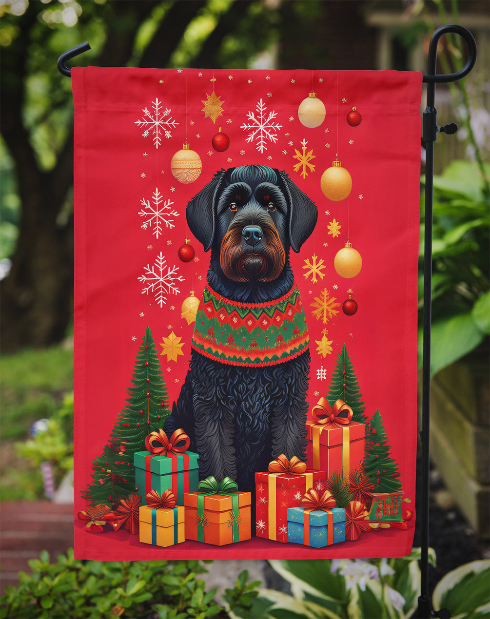 Decorate your space with our Christmas Black Russian Terrier artwork on a Garden Flag. Enhance the beauty of your garden, patio, or yard with Caroline's Treasures Decorative Garden Flag, proudly made in the USA. Crafted from two pieces of thick, double-sided polyester fabric, this 2-ply garden flag is designed to withstand various weather conditions, making it water-resistant and weatherproof. Featuring correctly readable words on both sides, this garden flag offers a delightful visual experience from any angle. With its heavier weight, it stands out among other garden flags, ensuring stability and durability even in wind, rain, and snow. Measuring approximately 11 1/4 inches by 15 1/2 inches, this flag allows you to personalize your outdoor decor. It comes with a 1 1/2-inch sleeve sewn in, allowing easy attachment to any standard garden flag stand or garden size porch hanger (sold separately). Make a statement in your outdoor space with Caroline's Treasures Decorative Garden Flag, a vibrant and high-quality flag that adds color and personality to your surroundings. Proudly made in the USA, it's a symbol of quality craftsmanship and attention to detail.