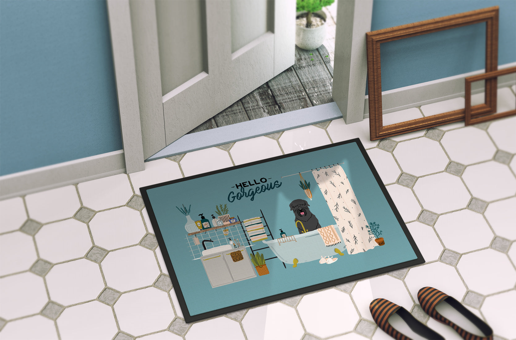 Decorate your space with our Black Russian Terrier artwork on a Doormat. Welcome your guests in style with our Artwork Door Mat, designed to withstand almost any weather condition. This mat, measuring approximately 24 by 36 inches, is held together by durable black binding tape. Its top layer, composed of polyester felt, is dyed with the eye-catching image you see on the mat. A few layers below provide the mat with stability, while its rubber bottom is stamped to help prevent slipping and ensures safety. Our mat works wonderfully as both an indoor or outdoor door mat. For cleaning, simply hose it off with water or use a power washer - no need for any cleaner that produces suds. Avoid scrubbing with a brush, instead, opt for the vacuum on floor setting. Designed manufactured and printed in the USA, this mat is a perfect addition to your porch, outdoor kitchen, entryway, or any indoor space. Its unique design makes it a charming decorative rug that greets your guests and adds a stylish touch to your home decor.