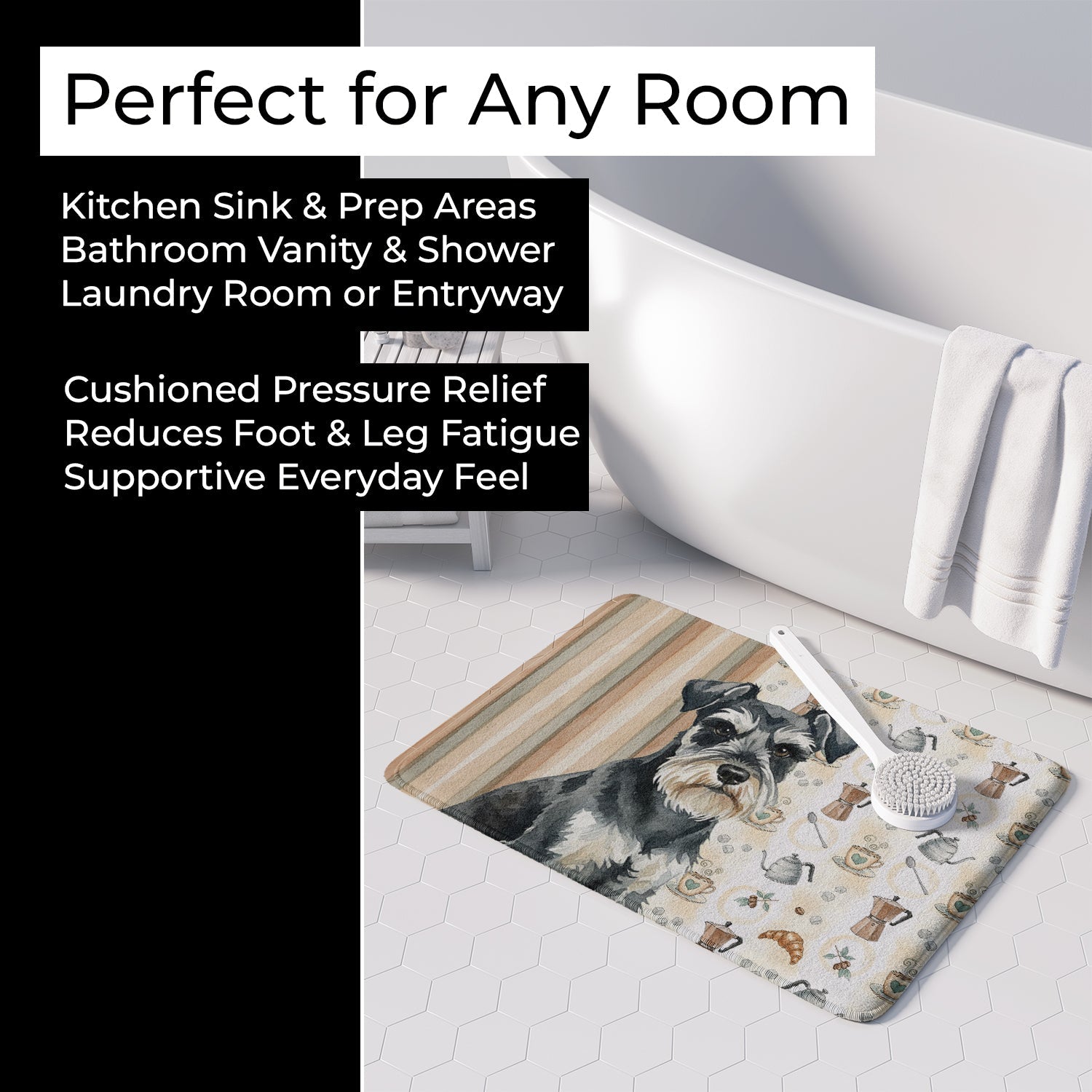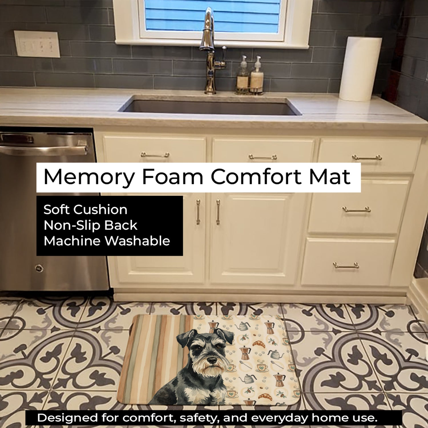 Shown here is the Black & Silver Miniature Schnauzer Coffee Bar Memory Foam Kitchen Mat from Caroline's Treasures featuring artwork of a Miniature Schnauzer in a Everyday design. The detailed illustration and vibrant colors make it a standout accent that celebrates both seasonal style and love for the subject. This image features a cozy watercolor coffee-themed pattern with illustrated mugs, moka pots, kettles, croissants, coffee beans, and sugar cubes arranged in a repeating design. Soft neutral tones with warm browns, creams, and subtle sage accents create an inviting, café-inspired look that feels comforting and relaxed. Everyday décor celebrates personal style and the small moments that make a house feel like home. Thoughtful designs add warmth and personality that can be enjoyed year-round. Transform your floor into a work of art with Caroline's Treasures' Memory Foam Mat. This mat offers not only a stunning visual appeal but also a luxurious, plush feel that's incredibly comfortable to the touch. It's a versatile, machine-washable mat designed for both bath and kitchen use, ensuring you experience the best in comfort and convenience. Care Instructions: Maintaining this memory foam mat is a breeze. Simply follow the care instructions on the product tag. It's recommended to wash in cold water and dry on a low-temperature setting in the dryer. This ensures the mat retains its quality and longevity, allowing you to enjoy its beauty and comfort for a long time. Caroline's Treasures' Memory Foam Mat Machine Washable is the perfect blend of artistry, comfort, and practicality, making it a standout addition to any space. Upgrade your home decor with this versatile and stylish mat today. Miniature Schnauzers display wiry coats and expressive faces. Their appearance feels alert and spirited. Makes a heartfelt gift for: Miniature Schnauzer owners, Dogs lovers, Everyday gifts, pet parents, friends who adore their Miniature Schnauzer, or anyone celebrating Dogs.