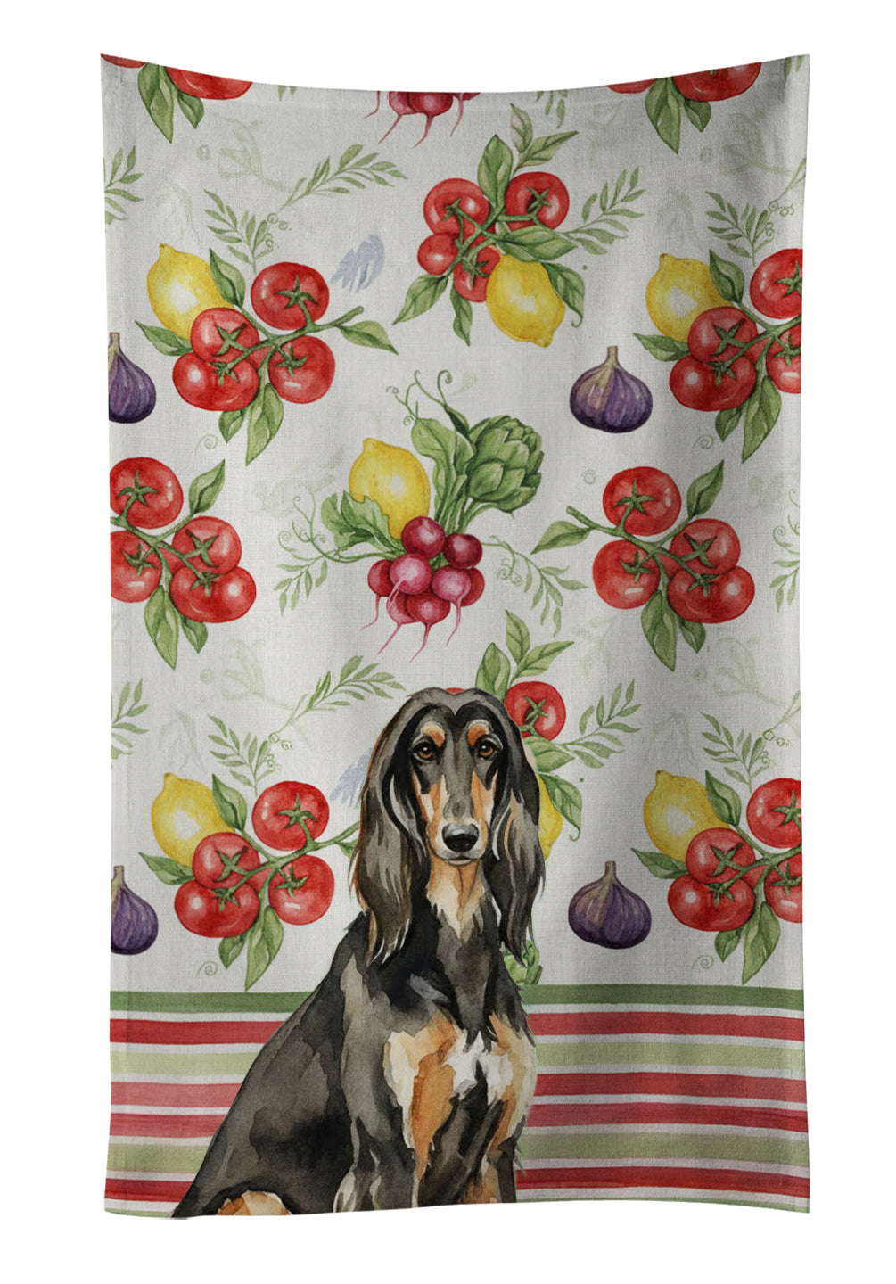 Shown here is the Black & Tan Afghan Hound Vegetables Kitchen Towel from Caroline's Treasures featuring artwork of a Afghan Hound in a Everyday design. The detailed illustration and vibrant colors make it a standout accent that celebrates both seasonal style and love for the subject. This image features a vibrant watercolor vegetable pattern with tomatoes, lemons, artichokes, figs, radishes, and leafy greens arranged in a repeating design, paired with classic red and green stripes. The bright, garden-fresh palette creates a cheerful, farmhouse-inspired look that feels lively, welcoming, and perfect for kitchen décor. Everyday décor celebrates personal style and the small moments that make a house feel like home. Thoughtful designs add warmth and personality that can be enjoyed year-round. Bring cozy everyday charm to your sink or powder room with a plush velour towel featuring original watercolor artwork. The front is a soft, color-rich minky polyester that polishes glassware to a brilliant shine; the back is 100% white cotton terry loop for quick absorbency on hands, dishes, and counters. Artwork is dyed into the fibers for lasting color that won’t crack or peel. Finished edges keep the shape wash after wash. Size: 15" x 25". Machine wash; tumble dry low. Designed and printed in the USA. Perfect for: Kitchen counters, ovens, and towel bars, everyday drying and cleanup, -themed kitchens, or year-round use for Afghan Hound lovers. Afghan Hounds are elegant sighthounds recognized for their long flowing coats, graceful movement, and dignified presence. Known for their independent nature and striking beauty, this ancient breed is admired by dog lovers who appreciate refinement and individuality. Makes a heartfelt gift for: Afghan Hound owners, lovers, Everyday gifts, pet parents, friends who adore their Afghan Hound, or anyone celebrating .