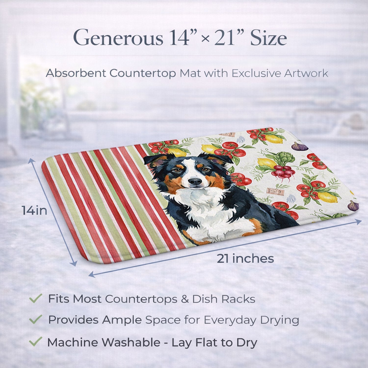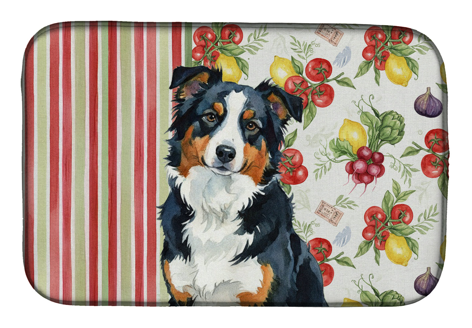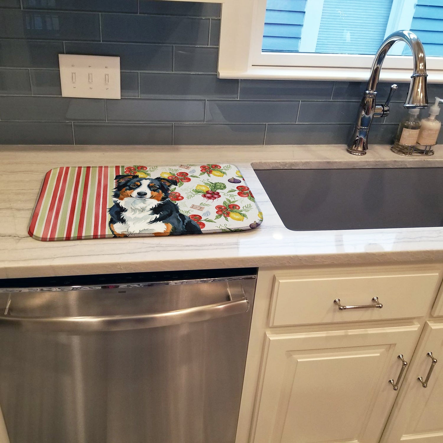 Shown here is the Black Tri American Shepherd Vegetables Dish Drying Mat from Caroline's Treasures featuring artwork of a American Shepherd in a Everyday design. The detailed illustration and vibrant colors make it a standout accent that celebrates both seasonal style and love for the subject. This image features a vibrant watercolor vegetable pattern with tomatoes, lemons, artichokes, figs, radishes, and leafy greens arranged in a repeating design, paired with classic red and green stripes. The bright, garden-fresh palette creates a cheerful, farmhouse-inspired look that feels lively, welcoming, and perfect for kitchen décor. Everyday décor celebrates personal style and the small moments that make a house feel like home. Thoughtful designs add warmth and personality that can be enjoyed year-round. Say goodbye to messy countertops and soggy dish towels with our innovative dish drying mat. Our high-quality dish drying pad is designed to keep your countertops dry while offering a stylish and efficient solution. Whether you're air drying dishes, glasses, stemware, silverware, pots, pans, bottles, or even fruits and vegetables, our dish mat is the perfect choice. The 14 inches x 21 inches size fits most counters and dish drying racks, and the non-slip design ensures stability. Made with water-absorbent polyester and a polyurethane foam insert, our dish drying mat is not only functional but also durable. It's machine washable and printed in the USA for long-lasting use. The beautiful artwork adds flair to your kitchen decor, making it a perfect housewarming gift or present for any occasion. Upgrade your kitchen experience with our absorbent and versatile dish drying mat. Perfect for: Kitchen counters and sinks, everyday dish drying and countertop protection, Dogs-themed homes, or year-round use for American Shepherd lovers. American Shepherds are intelligent, agile dogs known for their strong work ethic and loyal nature. Bred for herding and companionship, this breed thrives in active households and forms deep bonds with its family. Makes a heartfelt gift for: American Shepherd owners, Dogs lovers, Everyday gifts, pet parents, friends who adore their American Shepherd, or anyone celebrating Dogs.