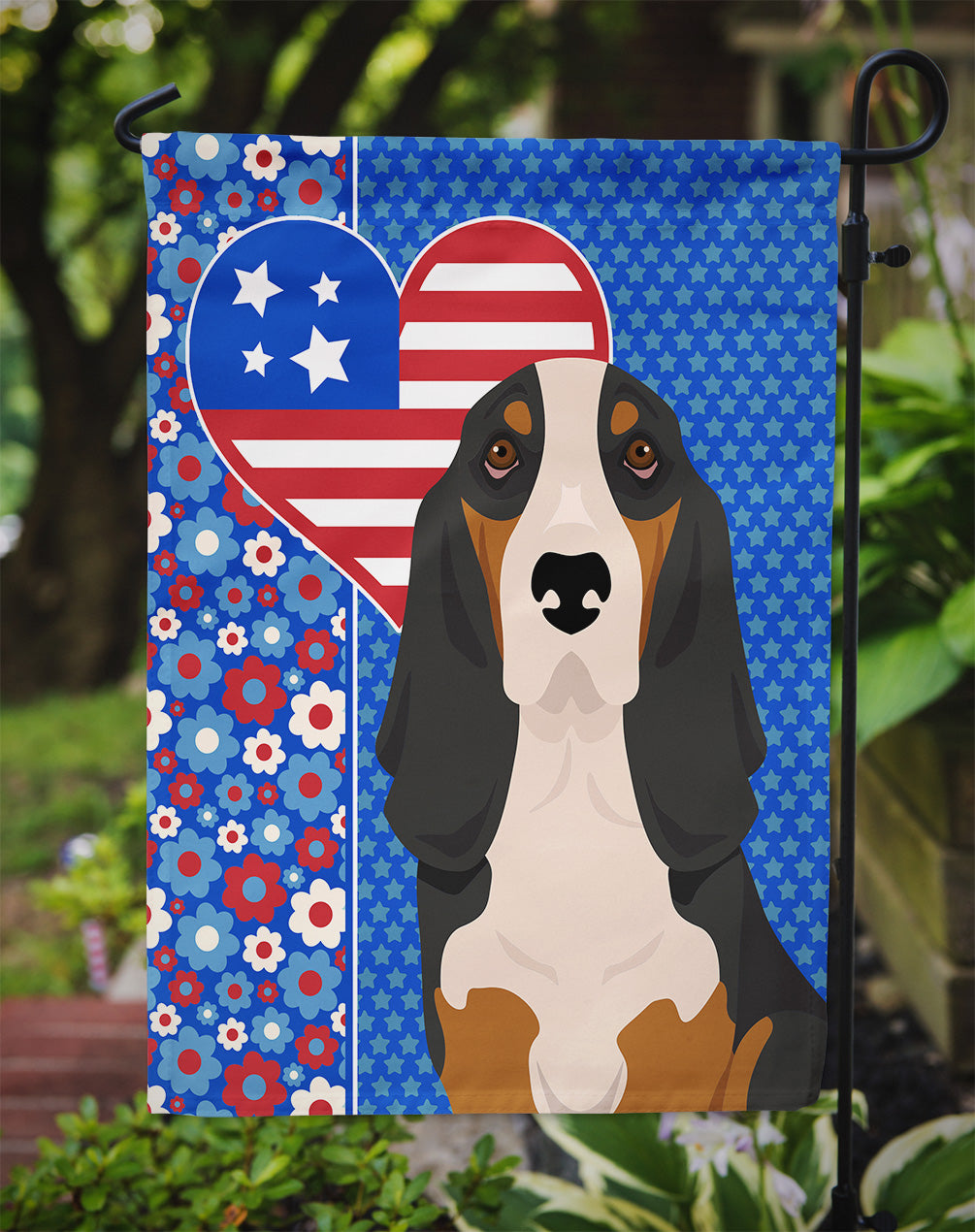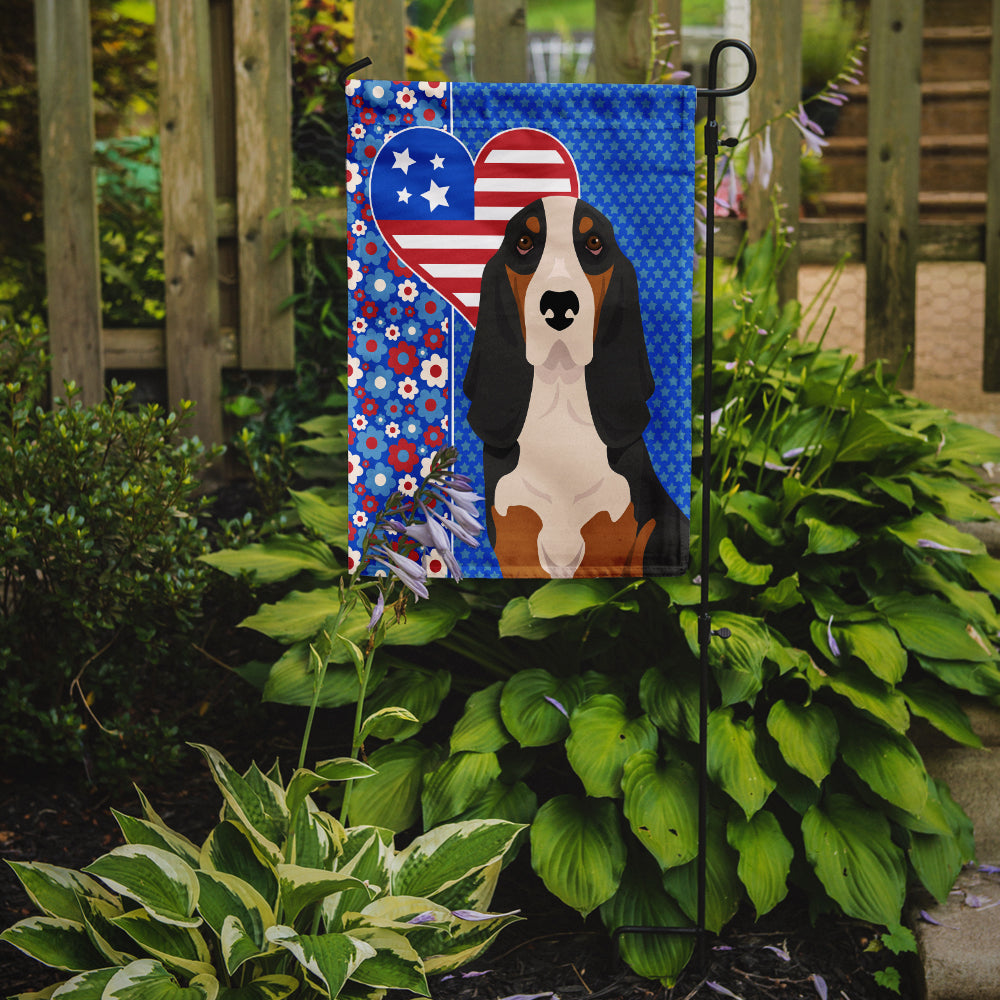 Decorate your space with our Basset Hound artwork on a Garden Flag. Enhance the beauty of your garden, patio, or yard with Caroline's Treasures Decorative Garden Flag, proudly made in the USA. Crafted from two pieces of thick, double-sided polyester fabric, this 2-ply garden flag is designed to withstand various weather conditions, making it water-resistant and weatherproof. Featuring correctly readable words on both sides, this garden flag offers a delightful visual experience from any angle. With its heavier weight, it stands out among other garden flags, ensuring stability and durability even in wind, rain, and snow. Measuring approximately 11 1/4 inches by 15 1/2 inches, this flag allows you to personalize your outdoor decor. It comes with a 1 1/2-inch sleeve sewn in, allowing easy attachment to any standard garden flag stand or garden size porch hanger (sold separately). Make a statement in your outdoor space with Caroline's Treasures Decorative Garden Flag, a vibrant and high-quality flag that adds color and personality to your surroundings. Proudly made in the USA, it's a symbol of quality craftsmanship and attention to detail.