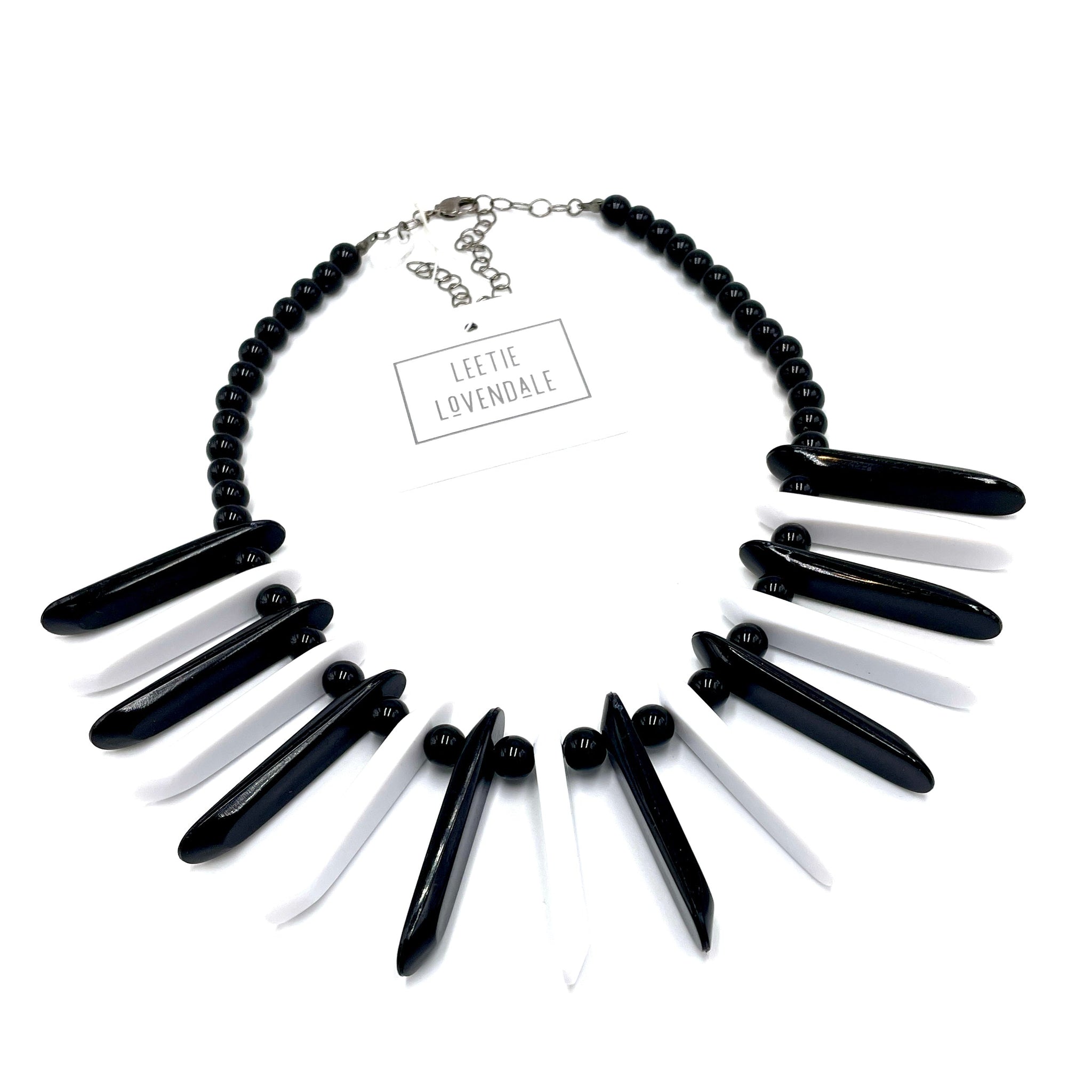 Black & white lucite necklace featuring vintage beads in a tusk or drop shape. This piece makes a modern statement in its geometry and boldness. The beads are from the 1960s and are super lightweight. Each necklace measures about 16" + a 6" extender. Finished with gun metal-colored findings.