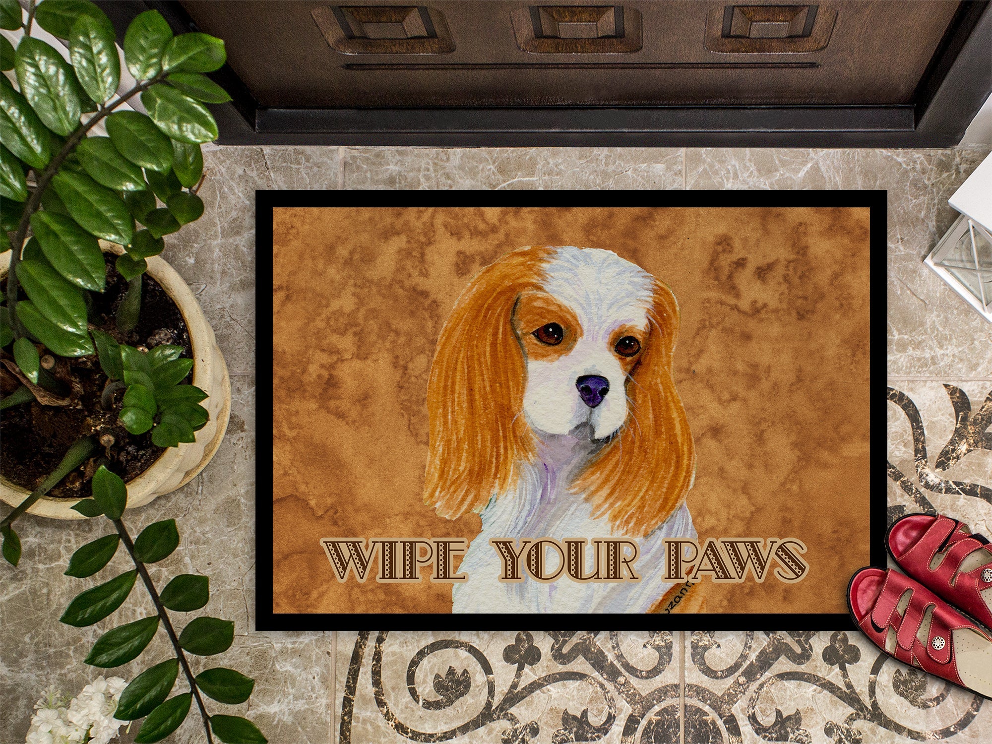 Decorate your space with our Cavalier King Charles Spaniel artwork on a Doormat. Welcome your guests in style with our Artwork Door Mat, designed to withstand almost any weather condition. This mat, measuring approximately 24 by 36 inches, is held together by durable black binding tape. Its top layer, composed of polyester felt, is dyed with the eye-catching image you see on the mat. A few layers below provide the mat with stability, while its rubber bottom is stamped to help prevent slipping and ensures safety. Our mat works wonderfully as both an indoor or outdoor door mat. For cleaning, simply hose it off with water or use a power washer - no need for any cleaner that produces suds. Avoid scrubbing with a brush, instead, opt for the vacuum on floor setting. Designed manufactured and printed in the USA, this mat is a perfect addition to your porch, outdoor kitchen, entryway, or any indoor space. Its unique design makes it a charming decorative rug that greets your guests and adds a stylish touch to your home decor.
