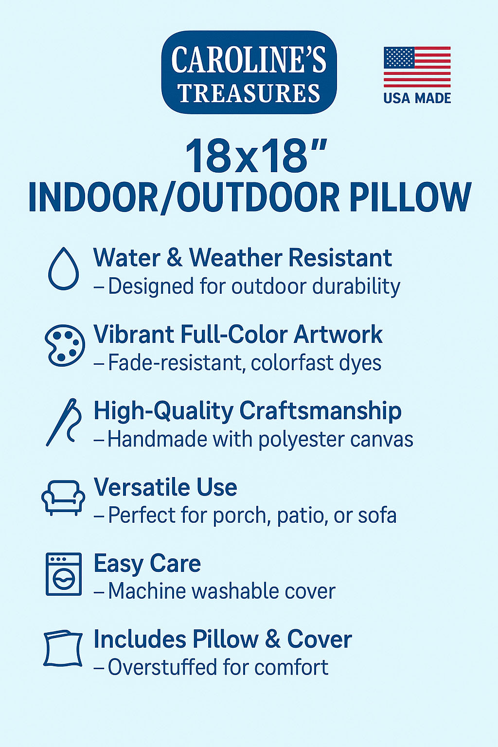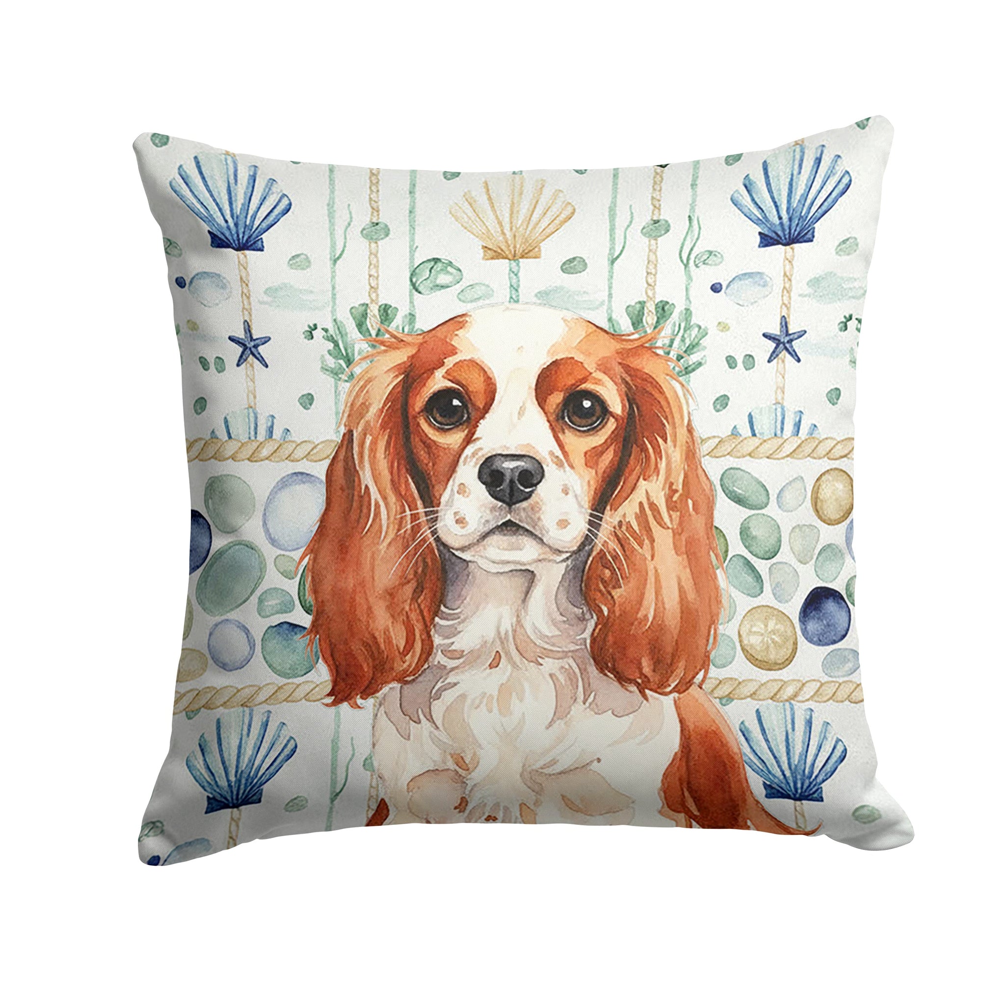 Throw Pillow featuring breed specific English Toy Spaniel artwork. Revitalize your outdoor or indoor living space with Caroline's Treasures 18x18 Fabric Decorative Pillow. With a generously sized dimension of approximately 18 inches by 18 inches, this pillow makes a comfortable and aesthetic addition to any seating area. Made from a unique, water-resistant material developed by Caroline's Treasures, the pillow sham is 100% polyester fabric that's durable and ready to weather any condition. Its vibrant, full-color artwork will not fade over time as it is dyed with color-fast dyes. Whether you place it on your patio furniture, porch, veranda, or indoor couch, its soft canvas fabric ensures a cozy experience. The pillow is handcrafted in the United States, featuring a sham created from three pieces of fabric and a polyester insert for enduring shape and overstuffed comfort. Despite being robustly built to endure the outdoors, it is as soft and snug as your favorite indoor cushions. Please note, as all our pillows are handmade, sizes may vary slightly, adding to the charm of this unique decorative item.