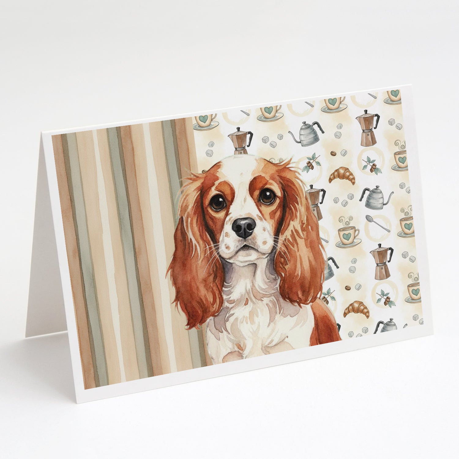 Shown here is the Blenheim English Toy Spaniel Coffee Bar Greeting Cards Pack of 8 from Caroline's Treasures featuring artwork of a English Toy Spaniel in a Everyday design. The detailed illustration and vibrant colors make it a standout accent that celebrates both seasonal style and love for the subject. This image features a cozy watercolor coffee-themed pattern with illustrated mugs, moka pots, kettles, croissants, coffee beans, and sugar cubes arranged in a repeating design. Soft neutral tones with warm browns, creams, and subtle sage accents create an inviting, café-inspired look that feels comforting and relaxed. Everyday décor celebrates personal style and the small moments that make a house feel like home. Thoughtful designs add warmth and personality that can be enjoyed year-round. Celebrate special moments with Caroline's Treasures Printed Greeting Card Pack. This pack includes eight beautifully folded 5x7 cards, accompanied by eight matching white envelopes. With blank interiors, these cards provide ample space for your personalized messages and heartfelt holiday greetings. Each card features captivating full-color artwork, meticulously printed in our facility on high-quality 80 lb cover stock or 216 GSM. The super smooth finish of the white cards enhances the visual impact of the artwork, creating a truly stunning presentation. Designed by our talented in-house artists or licensed artists, the artwork on these cards showcases their creativity and attention to detail. From vibrant illustrations to captivating designs, each card tells its own unique story. Whether it's for birthdays, anniversaries, holidays, or any special occasion, Caroline's Treasures Greeting Card Pack is the perfect way to convey your heartfelt sentiments. Share joy, love, and warm wishes with these exquisite cards and make every moment unforgettable. Perfect for: Writing personal messages, everyday correspondence, and thoughtful notes, Dogs-themed stationery collections, or year-round use for English Toy Spaniel lovers. English Toy Spaniels are affectionate companion dogs known for their gentle nature and expressive eyes. This historic breed is cherished for its calm temperament and devotion to family. Makes a heartfelt gift for: English Toy Spaniel owners, Dogs lovers, Everyday gifts, pet parents, friends who adore their English Toy Spaniel, or anyone celebrating Dogs.