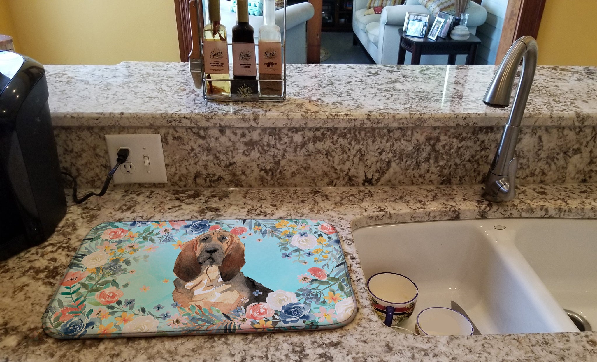 Decorate your space with our Bloodhound artwork on a Dish Drying Mat. Say goodbye to messy countertops and soggy dish towels with our innovative dish drying mat. Our high-quality dish drying pad is designed to keep your countertops dry while offering a stylish and efficient solution. Whether you're air drying dishes, glasses, stemware, silverware, pots, pans, bottles, or even fruits and vegetables, our dish mat is the perfect choice. The 14 inches x 22 inches size fits most counters and dish drying racks, and the non-slip design ensures stability. Made with water-absorbent polyester and a polyurethane foam insert, our dish drying mat is not only functional but also durable. It's machine washable and printed in the USA for long-lasting use. The beautiful artwork adds flair to your kitchen decor, making it a perfect housewarming gift or present for any occasion. Upgrade your kitchen experience with our absorbent and versatile dish drying mat.
