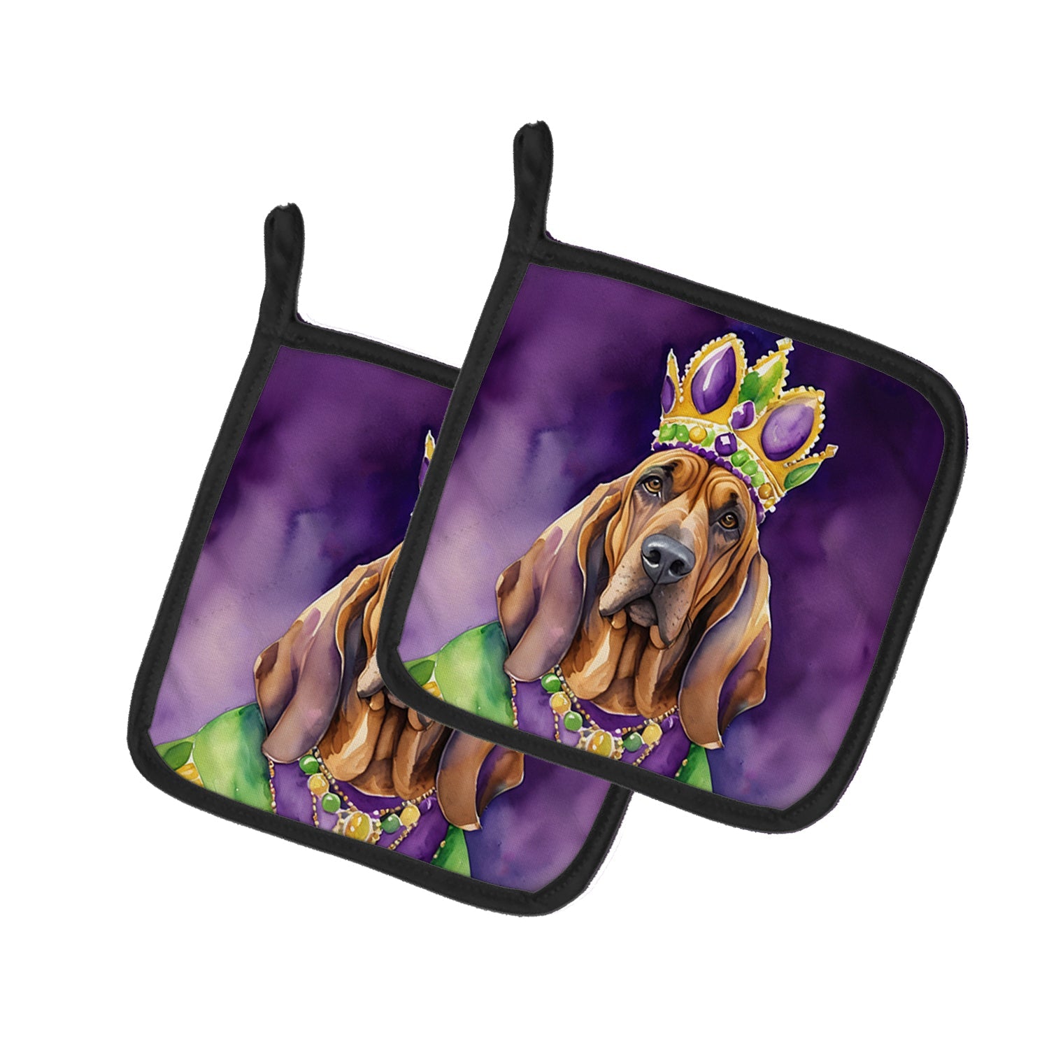 Pair of Pot Holders featuring breed specific Bloodhound artwork. Celebrate Mardi Gras with this Mardi Gras Pair of Pot Holders. A Pair of Pot Holders to match your kitchen decor. Made in the USA these are thick and functional. Full color artwork decorates the front polyester fabric of the hot pad and accented by a black trim. Use these at as a trivet for your Thanksgiving or Christmas tablescape. Filled with insulated fabric and quilted for durability. These colorful pot holders will make a great gift for your favorite home cook or executive chef. Each pot holder measures approximately 7 1/2 inches by 7 1/2 inches. A hanging tab is included.