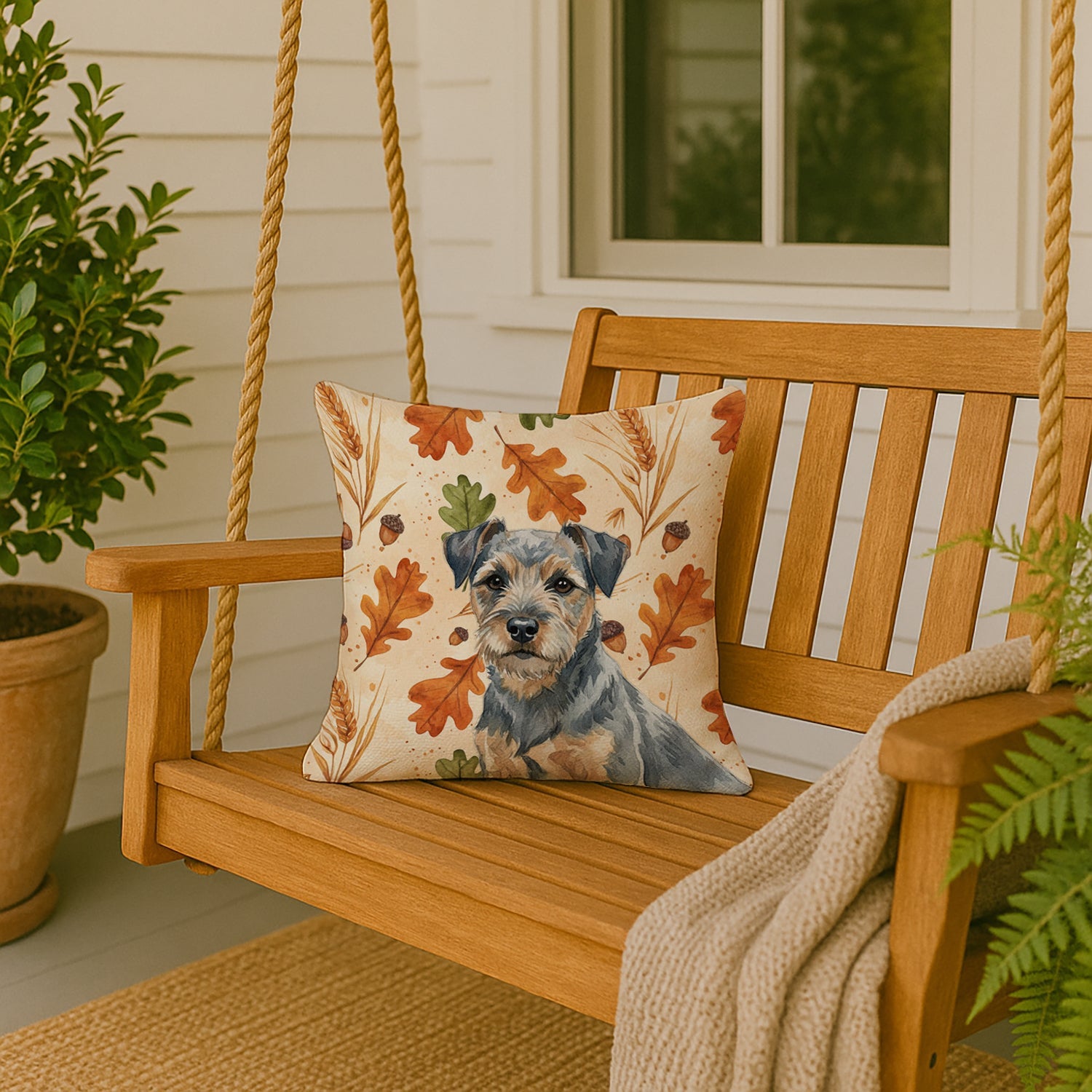 Throw Pillow featuring breed specific Border Terrier artwork. Celebrate Thanksgiving with this Thanksgiving Pillow. Revitalize your outdoor or indoor living space with Caroline's Treasures 18x18 Fabric Decorative Pillow. With a generously sized dimension of approximately 18 inches by 18 inches, this pillow makes a comfortable and aesthetic addition to any seating area. Made from a unique, water-resistant material developed by Caroline's Treasures, the pillow sham is 100% polyester fabric that's durable and ready to weather any condition. Its vibrant, full-color artwork will not fade over time as it is dyed with color-fast dyes. Whether you place it on your patio furniture, porch, veranda, or indoor couch, its soft canvas fabric ensures a cozy experience. The pillow is handcrafted in the United States, featuring a sham created from three pieces of fabric and a polyester insert for enduring shape and overstuffed comfort. Despite being robustly built to endure the outdoors, it is as soft and snug as your favorite indoor cushions. Please note, as all our pillows are handmade, sizes may vary slightly, adding to the charm of this unique decorative item.