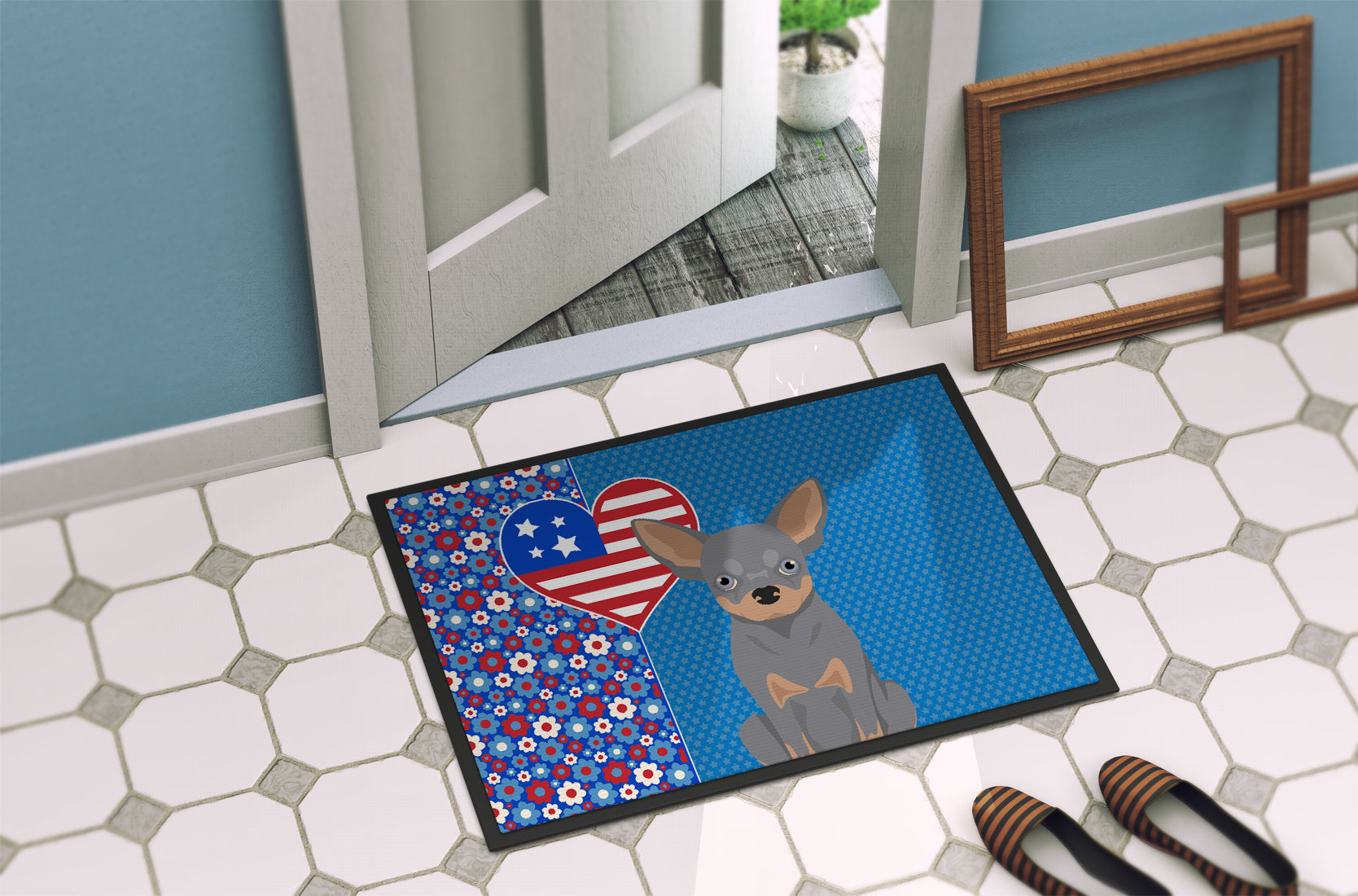 Blue and Tan Chihuahua USA American Doormat - 24x36 Decorative Floor Mat – Indoor/Outdoor Rug with Artistic Flair