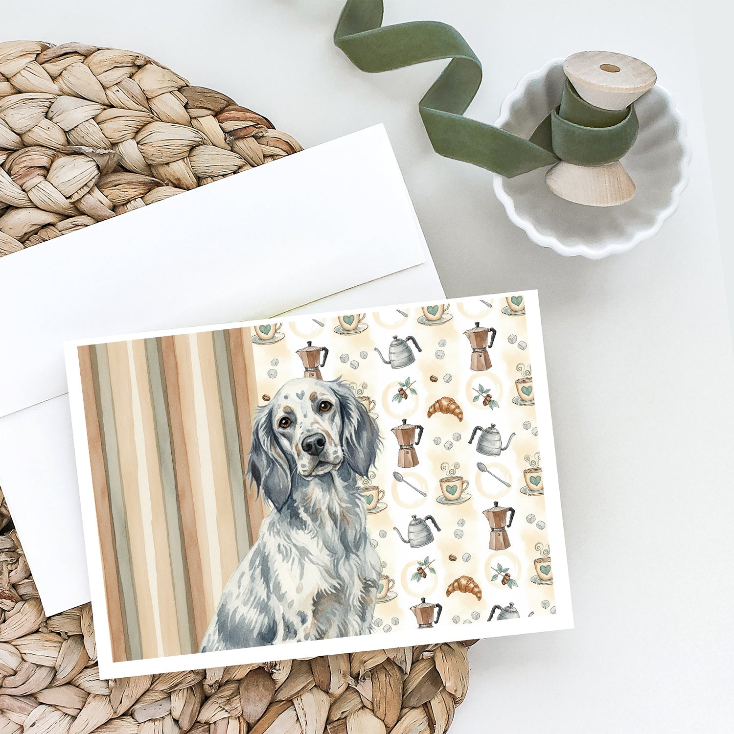 Shown here is the Blue Belton English Setter Coffee Bar Greeting Cards Pack of 8 from Caroline's Treasures featuring artwork of a English Setter in a Everyday design. The detailed illustration and vibrant colors make it a standout accent that celebrates both seasonal style and love for the subject. This image features a cozy watercolor coffee-themed pattern with illustrated mugs, moka pots, kettles, croissants, coffee beans, and sugar cubes arranged in a repeating design. Soft neutral tones with warm browns, creams, and subtle sage accents create an inviting, café-inspired look that feels comforting and relaxed. Everyday décor celebrates personal style and the small moments that make a house feel like home. Thoughtful designs add warmth and personality that can be enjoyed year-round. Celebrate special moments with Caroline's Treasures Printed Greeting Card Pack. This pack includes eight beautifully folded 5x7 cards, accompanied by eight matching white envelopes. With blank interiors, these cards provide ample space for your personalized messages and heartfelt holiday greetings. Each card features captivating full-color artwork, meticulously printed in our facility on high-quality 80 lb cover stock or 216 GSM. The super smooth finish of the white cards enhances the visual impact of the artwork, creating a truly stunning presentation. Designed by our talented in-house artists or licensed artists, the artwork on these cards showcases their creativity and attention to detail. From vibrant illustrations to captivating designs, each card tells its own unique story. Whether it's for birthdays, anniversaries, holidays, or any special occasion, Caroline's Treasures Greeting Card Pack is the perfect way to convey your heartfelt sentiments. Share joy, love, and warm wishes with these exquisite cards and make every moment unforgettable. Perfect for: Writing personal messages, everyday correspondence, and thoughtful notes, Dogs-themed stationery collections, or year-round use for English Setter lovers. English Setters are elegant sporting dogs known for their graceful movement and friendly temperament. This breed is valued for its intelligence, endurance, and affectionate nature. Makes a heartfelt gift for: English Setter owners, Dogs lovers, Everyday gifts, pet parents, friends who adore their English Setter, or anyone celebrating Dogs.