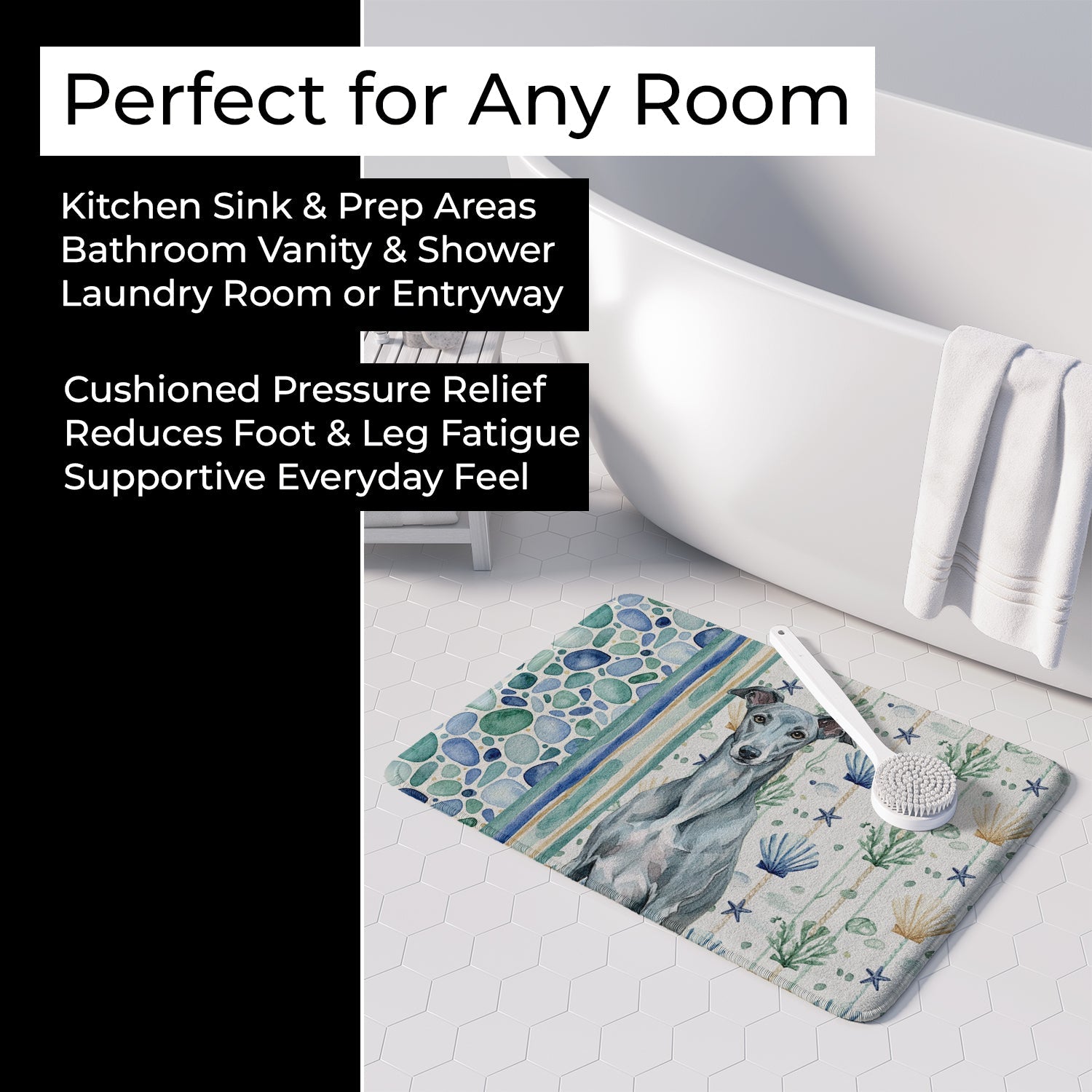 Shown here is the Blue Brindle Greyhound Coastal Sea Glass Memory Foam Kitchen Mat from Caroline's Treasures featuring artwork of a Greyhound in a Everyday design. The detailed illustration and vibrant colors make it a standout accent that celebrates both seasonal style and love for the subject. This image features a calming coastal watercolor pattern with soft seashells, seaweed, starfish, and pebble-inspired accents arranged in a repeating design. The soothing palette of blues, greens, and sandy neutrals creates a relaxed, beach-inspired look that adds a fresh and tranquil feel to any space. Everyday décor celebrates personal style and the small moments that make a house feel like home. Thoughtful designs add warmth and personality that can be enjoyed year-round. Transform your floor into a work of art with Caroline's Treasures' Memory Foam Mat. This mat offers not only a stunning visual appeal but also a luxurious, plush feel that's incredibly comfortable to the touch. It's a versatile, machine-washable mat designed for both bath and kitchen use, ensuring you experience the best in comfort and convenience. Care Instructions: Maintaining this memory foam mat is a breeze. Simply follow the care instructions on the product tag. It's recommended to wash in cold water and dry on a low-temperature setting in the dryer. This ensures the mat retains its quality and longevity, allowing you to enjoy its beauty and comfort for a long time. Caroline's Treasures' Memory Foam Mat Machine Washable is the perfect blend of artistry, comfort, and practicality, making it a standout addition to any space. Upgrade your home decor with this versatile and stylish mat today. Greyhounds are sleek sighthounds known for their speed and graceful movement. Despite their athletic ability, this breed is admired for its gentle temperament and calm disposition. Makes a heartfelt gift for: Greyhound owners, Dogs lovers, Everyday gifts, pet parents, friends who adore their Greyhound, or anyone celebrating Dogs.