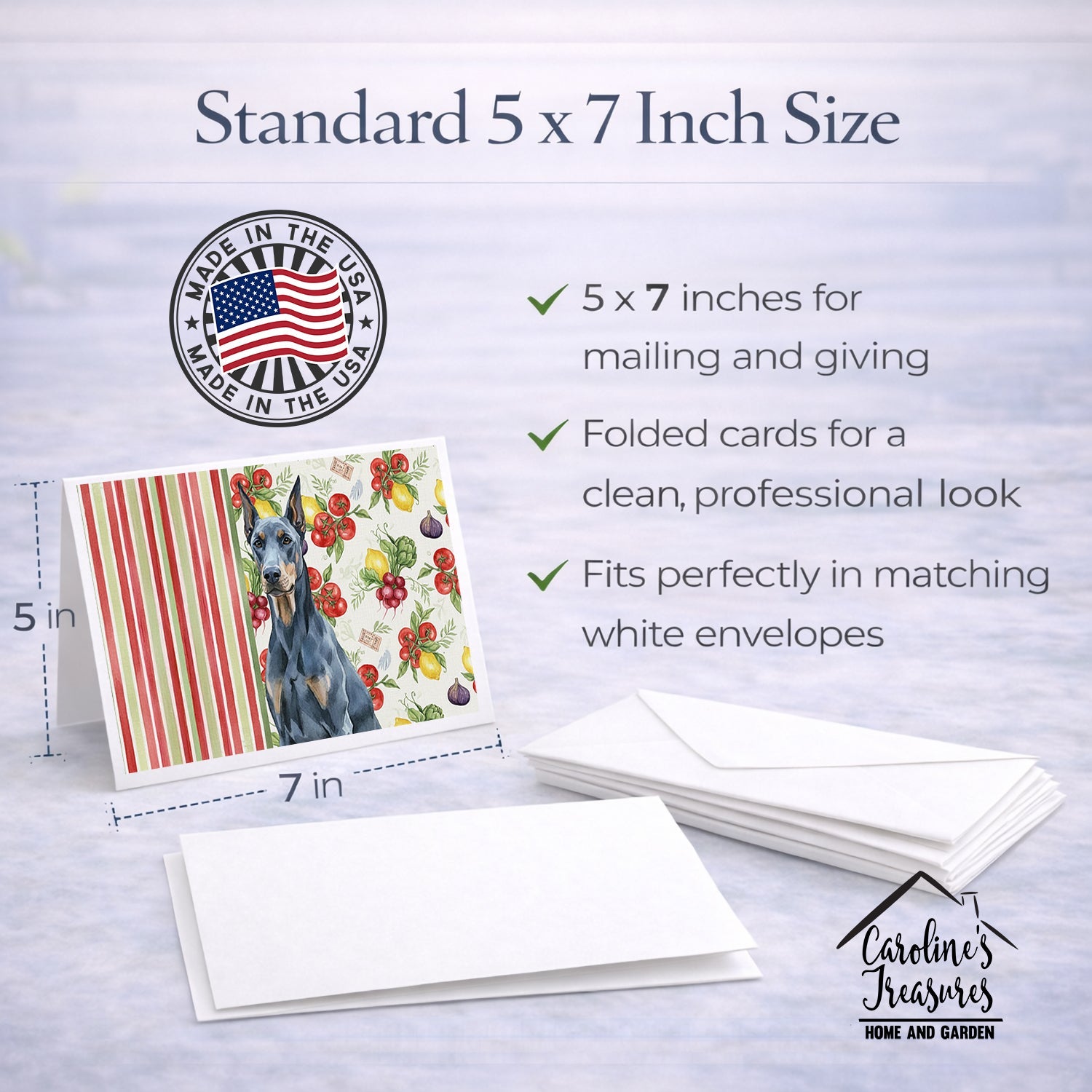 Shown here is the Blue Doberman Pinscher Vegetables Greeting Cards Pack of 8 from Caroline's Treasures featuring artwork of a Doberman Pinscher in a Everyday design. The detailed illustration and vibrant colors make it a standout accent that celebrates both seasonal style and love for the subject. This image features a vibrant watercolor vegetable pattern with tomatoes, lemons, artichokes, figs, radishes, and leafy greens arranged in a repeating design, paired with classic red and green stripes. The bright, garden-fresh palette creates a cheerful, farmhouse-inspired look that feels lively, welcoming, and perfect for kitchen décor. Everyday décor celebrates personal style and the small moments that make a house feel like home. Thoughtful designs add warmth and personality that can be enjoyed year-round. Celebrate special moments with Caroline's Treasures Printed Greeting Card Pack. This pack includes eight beautifully folded 5x7 cards, accompanied by eight matching white envelopes. With blank interiors, these cards provide ample space for your personalized messages and heartfelt holiday greetings. Each card features captivating full-color artwork, meticulously printed in our facility on high-quality 80 lb cover stock or 216 GSM. The super smooth finish of the white cards enhances the visual impact of the artwork, creating a truly stunning presentation. Designed by our talented in-house artists or licensed artists, the artwork on these cards showcases their creativity and attention to detail. From vibrant illustrations to captivating designs, each card tells its own unique story. Whether it's for birthdays, anniversaries, holidays, or any special occasion, Caroline's Treasures Greeting Card Pack is the perfect way to convey your heartfelt sentiments. Share joy, love, and warm wishes with these exquisite cards and make every moment unforgettable. Perfect for: Writing personal messages, everyday correspondence, and thoughtful notes, Dogs-themed stationery collections, or year-round use for Doberman Pinscher lovers. Doberman Pinschers are sleek, athletic dogs with confident posture. Their appearance reflects strength and loyalty. Makes a heartfelt gift for: Doberman Pinscher owners, Dogs lovers, Everyday gifts, pet parents, friends who adore their Doberman Pinscher, or anyone celebrating Dogs.
