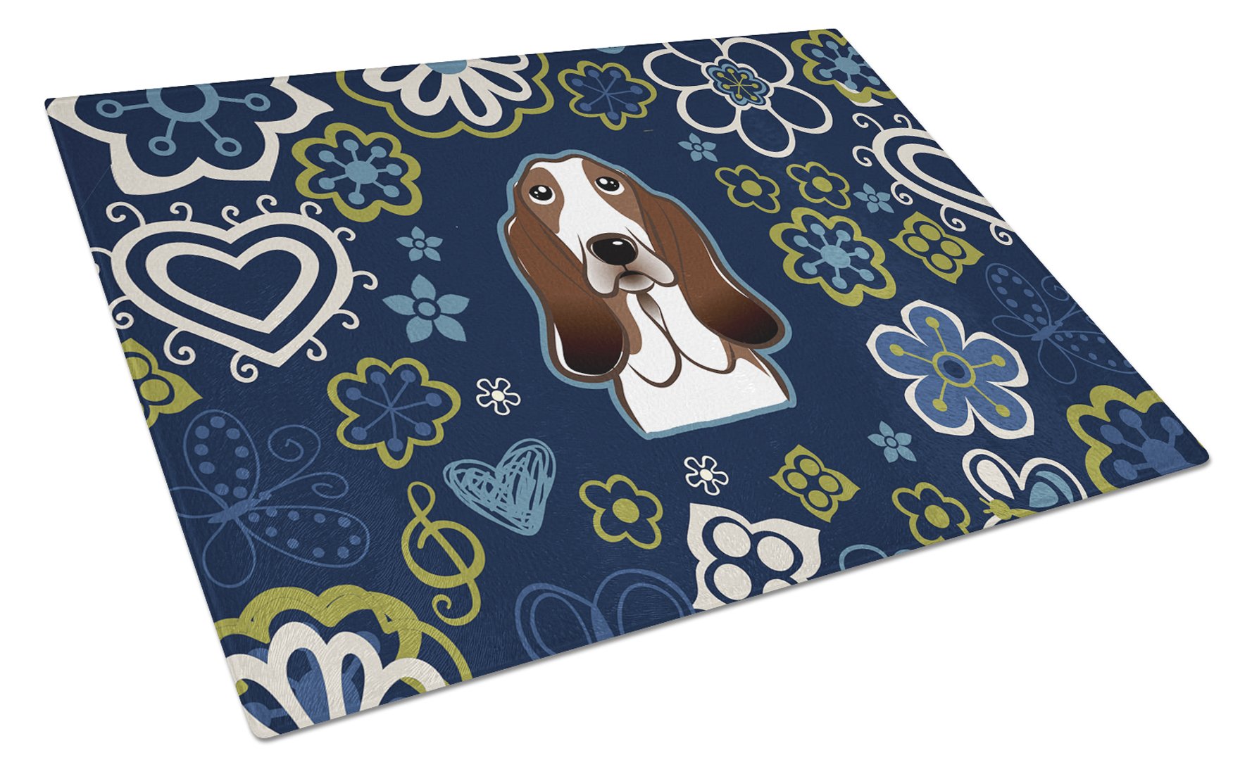 Blue Flowers Basset Hound Glass Cutting Boards – Durable, Decorative Kitchen Art Large BB5094LCB