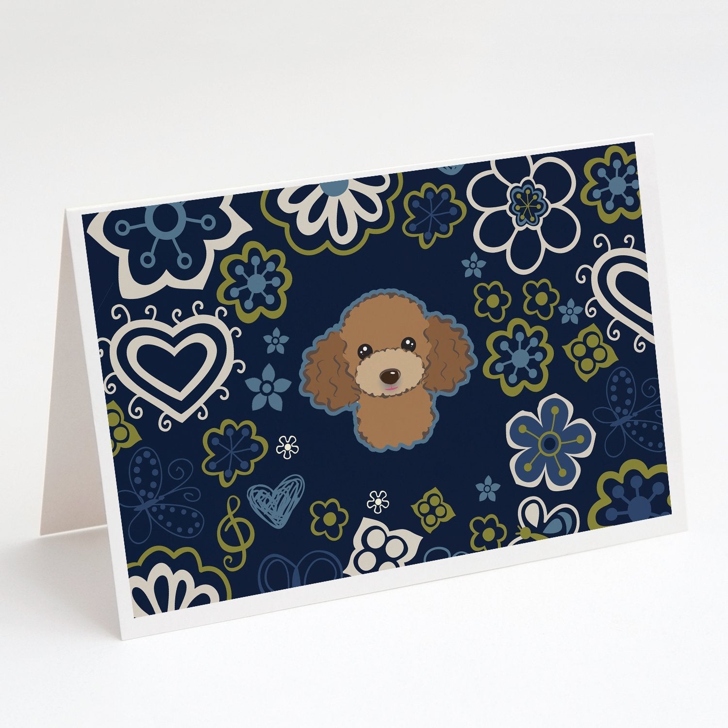 Blue Flowers Chocolate Brown Poodle Greeting Cards -  Blank Note Cards – 8-Pack of Artist-Designed Cards with Envelopes