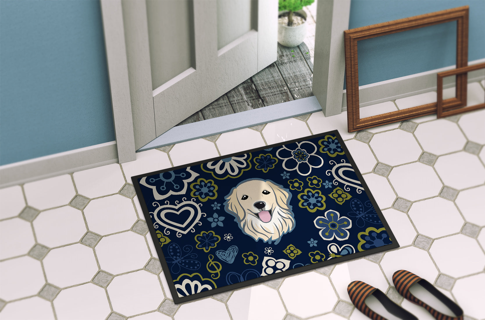 Decorate your space with our Golden Retriever artwork on a Doormat. Welcome your guests in style with our Artwork Door Mat, designed to withstand almost any weather condition. This mat, measuring approximately 24 by 36 inches, is held together by durable black binding tape. Its top layer, composed of polyester felt, is dyed with the eye-catching image you see on the mat. A few layers below provide the mat with stability, while its rubber bottom is stamped to help prevent slipping and ensures safety. Our mat works wonderfully as both an indoor or outdoor door mat. For cleaning, simply hose it off with water or use a power washer - no need for any cleaner that produces suds. Avoid scrubbing with a brush, instead, opt for the vacuum on floor setting. Designed manufactured and printed in the USA, this mat is a perfect addition to your porch, outdoor kitchen, entryway, or any indoor space. Its unique design makes it a charming decorative rug that greets your guests and adds a stylish touch to your home decor.