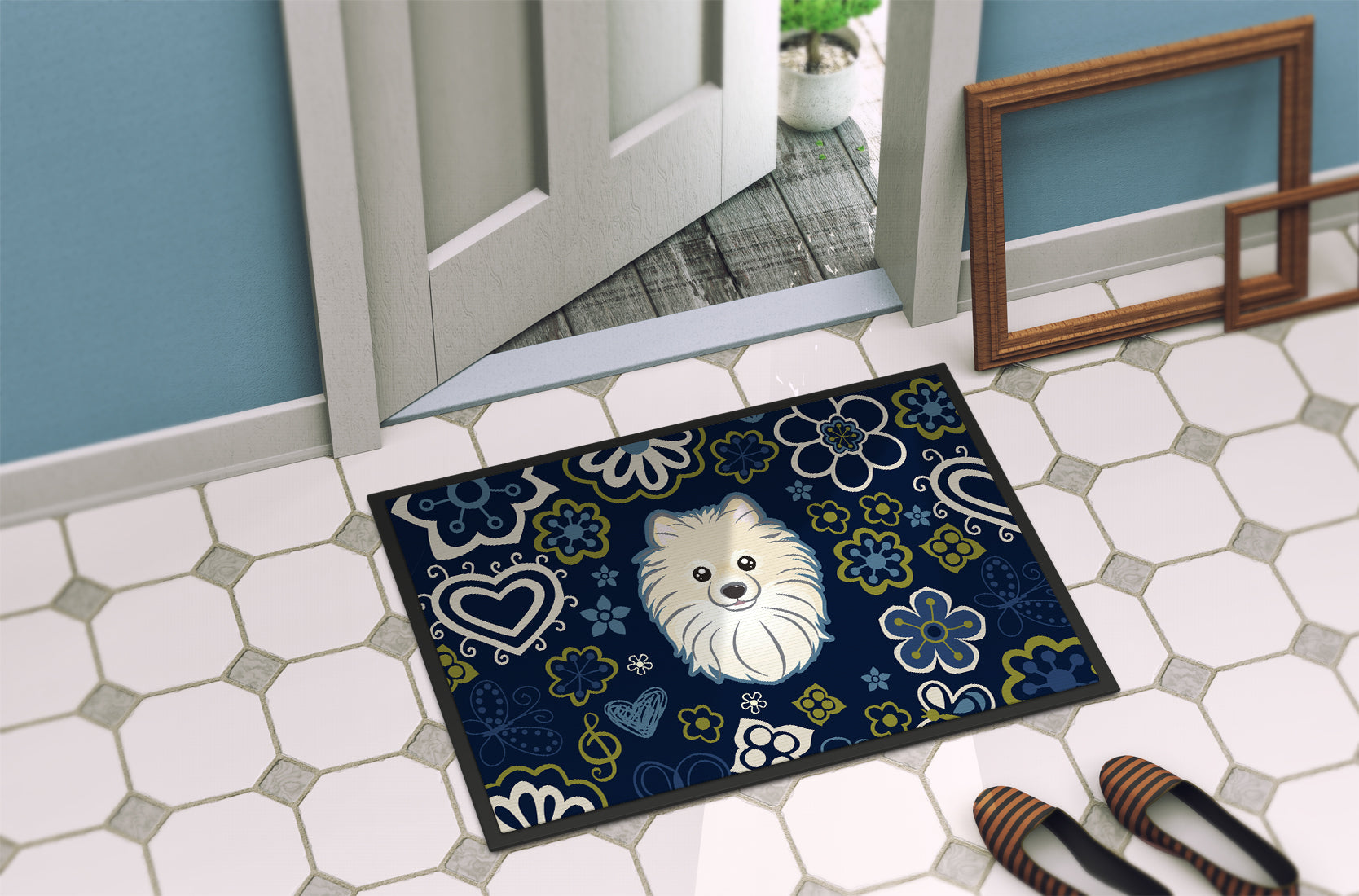 Decorate your space with our Pomeranian artwork on a Doormat. Welcome your guests in style with our Artwork Door Mat, designed to withstand almost any weather condition. This mat, measuring approximately 18 by 27 inches, is held together by durable black binding tape. Its top layer, composed of polyester felt, is dyed with the eye-catching image you see on the mat. A few layers below provide the mat with stability, while its rubber bottom is stamped to help prevent slipping and ensures safety. Our mat works wonderfully as both an indoor or outdoor door mat. For cleaning, simply hose it off with water or use a power washer - no need for any cleaner that produces suds. Avoid scrubbing with a brush, instead, opt for the vacuum on floor setting. Designed manufactured and printed in the USA, this mat is a perfect addition to your porch, outdoor kitchen, entryway, or any indoor space. Its unique design makes it a charming decorative rug that greets your guests and adds a stylish touch to your home decor.