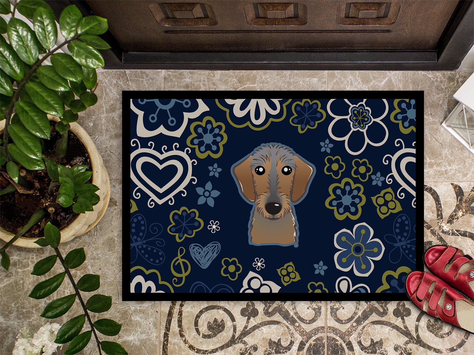 Blue Flowers Wirehaired Dachshund Doormat - 18x27 Decorative Floor Mat – Indoor/Outdoor Rug with Artistic Flair BB5084MAT