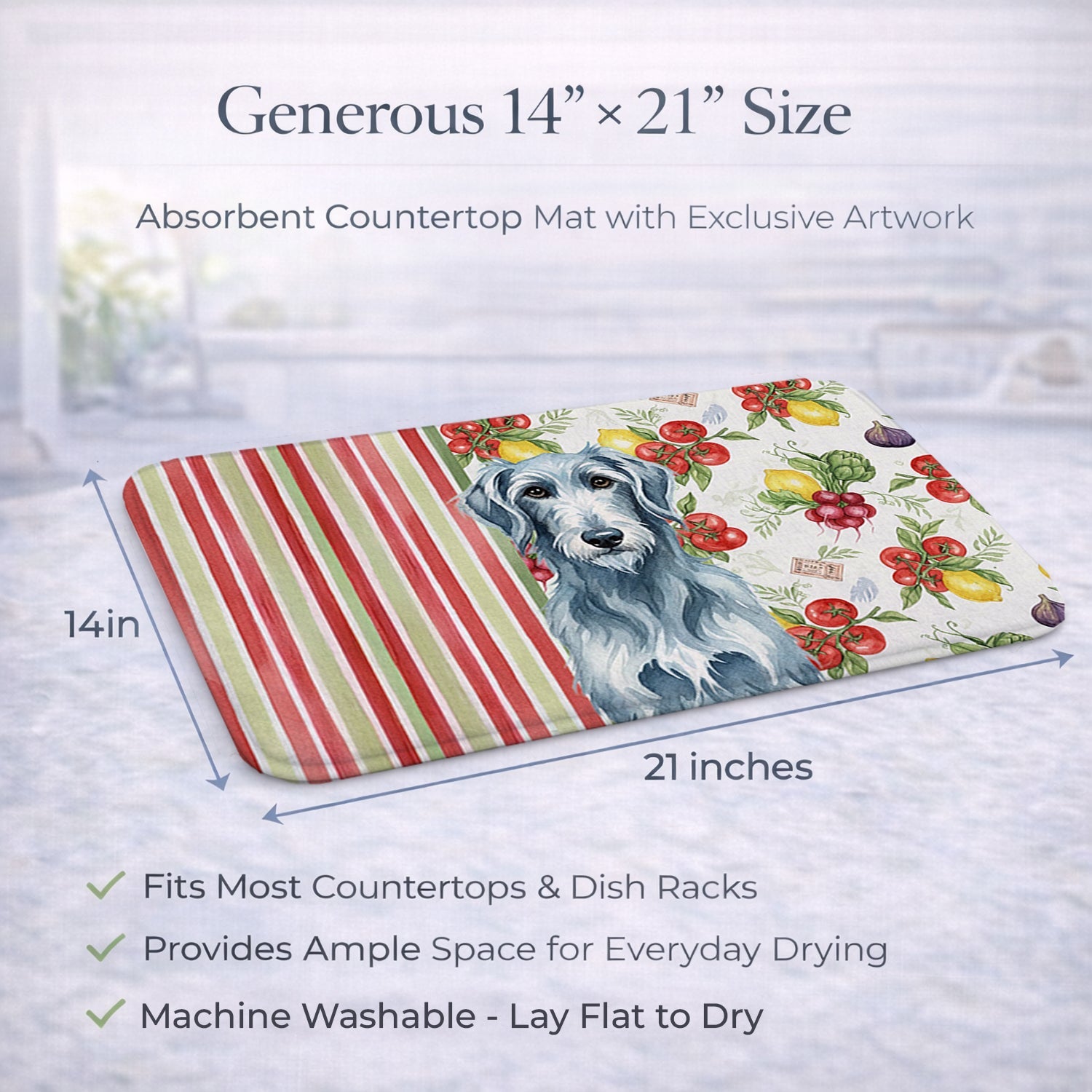 Shown here is the Blue-Gray Scottish Deerhound Vegetables Dish Drying Mat from Caroline's Treasures featuring artwork of a Scottish Deerhound in a Everyday design. The detailed illustration and vibrant colors make it a standout accent that celebrates both seasonal style and love for the subject. This image features a vibrant watercolor vegetable pattern with tomatoes, lemons, artichokes, figs, radishes, and leafy greens arranged in a repeating design, paired with classic red and green stripes. The bright, garden-fresh palette creates a cheerful, farmhouse-inspired look that feels lively, welcoming, and perfect for kitchen décor. Everyday décor celebrates personal style and the small moments that make a house feel like home. Thoughtful designs add warmth and personality that can be enjoyed year-round. Say goodbye to messy countertops and soggy dish towels with our innovative dish drying mat. Our high-quality dish drying pad is designed to keep your countertops dry while offering a stylish and efficient solution. Whether you're air drying dishes, glasses, stemware, silverware, pots, pans, bottles, or even fruits and vegetables, our dish mat is the perfect choice. The 14 inches x 21 inches size fits most counters and dish drying racks, and the non-slip design ensures stability. Made with water-absorbent polyester and a polyurethane foam insert, our dish drying mat is not only functional but also durable. It's machine washable and printed in the USA for long-lasting use. The beautiful artwork adds flair to your kitchen decor, making it a perfect housewarming gift or present for any occasion. Upgrade your kitchen experience with our absorbent and versatile dish drying mat. Perfect for: Kitchen counters and sinks, everyday dish drying and countertop protection, Dogs-themed homes, or year-round use for Scottish Deerhound lovers. Scottish Deerhounds are large sighthounds known for their grace and calm demeanor. This noble breed is admired for its gentle temperament and quiet strength. Makes a heartfelt gift for: Scottish Deerhound owners, Dogs lovers, Everyday gifts, pet parents, friends who adore their Scottish Deerhound, or anyone celebrating Dogs.