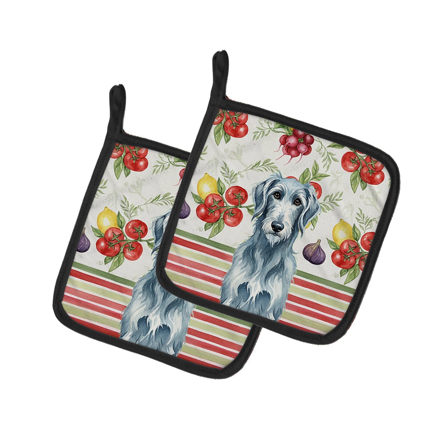 Pair of Pot Holders featuring breed specific Scottish Deerhound artwork. Add warmth, personality, and function to your kitchen with our Vegetables Pot Holder Pair. Each set includes two quilted hot pads, featuring original full-color watercolor artwork on a soft polyester front accented by black trim. Crafted with multiple layers for performance: Top Layer: Vibrant artwork permanently dyed into polyester fabric. Middle Layer: US-manufactured insulated material with breathable polyester fibers and a reflective metalized film that reflects heat back to its source. Bottom Layer: A silver heat-resistant backing for extra protection. Each pot holder measures 7.5" x 7.5", includes a hanging tab, and is quilted for durability. Use them to protect your hands, countertops, and tabletops — or as decorative trivets for Thanksgiving, Christmas, or everyday meals.