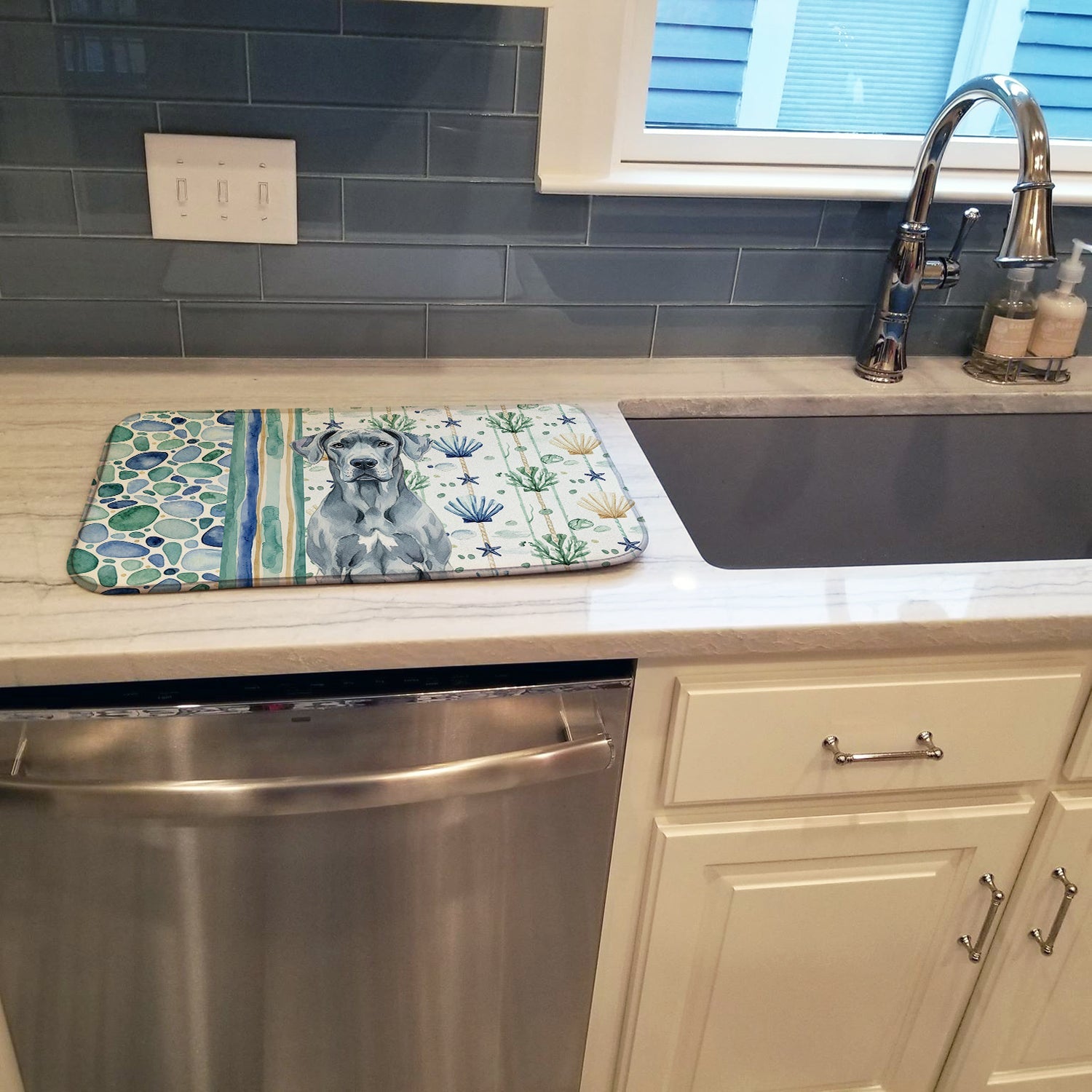 Shown here is the Blue Great Dane Coastal Sea Glass Dish Drying Mat from Caroline's Treasures featuring artwork of a Great Dane in a Everyday design. The detailed illustration and vibrant colors make it a standout accent that celebrates both seasonal style and love for the subject. This image features a calming coastal watercolor pattern with soft seashells, seaweed, starfish, and pebble-inspired accents arranged in a repeating design. The soothing palette of blues, greens, and sandy neutrals creates a relaxed, beach-inspired look that adds a fresh and tranquil feel to any space. Everyday décor celebrates personal style and the small moments that make a house feel like home. Thoughtful designs add warmth and personality that can be enjoyed year-round. Say goodbye to messy countertops and soggy dish towels with our innovative dish drying mat. Our high-quality dish drying pad is designed to keep your countertops dry while offering a stylish and efficient solution. Whether you're air drying dishes, glasses, stemware, silverware, pots, pans, bottles, or even fruits and vegetables, our dish mat is the perfect choice. The 14 inches x 21 inches size fits most counters and dish drying racks, and the non-slip design ensures stability. Made with water-absorbent polyester and a polyurethane foam insert, our dish drying mat is not only functional but also durable. It's machine washable and printed in the USA for long-lasting use. The beautiful artwork adds flair to your kitchen decor, making it a perfect housewarming gift or present for any occasion. Upgrade your kitchen experience with our absorbent and versatile dish drying mat. Perfect for: Kitchen counters and sinks, everyday dish drying and countertop protection, Dogs-themed homes, or year-round use for Great Dane lovers. Great Danes are giant companion dogs known for their gentle temperament and imposing size. Often called gentle giants, this breed is loved for its loyalty and calm demeanor. Makes a heartfelt gift for: Great Dane owners, Dogs lovers, Everyday gifts, pet parents, friends who adore their Great Dane, or anyone celebrating Dogs.