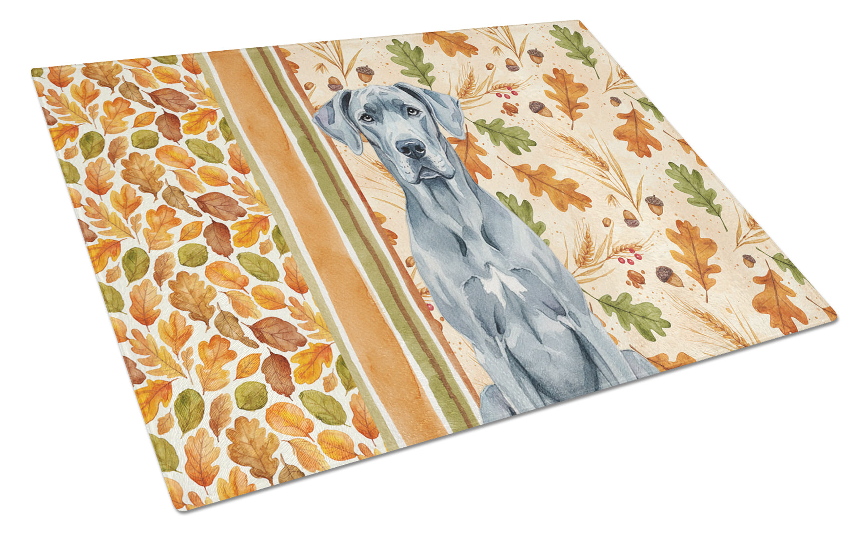 Glass Cutting Board featuring breed specific Great Dane artwork. Celebrate Thanksgiving with this Thanksgiving Cutting Board. Introduce your kitchen to the vibrant, large Decorative Glass Cutting Board from Caroline's Treasures. Crafted from resilient tempered glass, this board is not only a utilitarian necessity but also a colorful art piece. With its generous dimensions of 15 inches in height and 12 inches in length, it offers ample space for all your cutting needs. Every piece showcases captivating artwork from distinguished artists, bringing an aesthetic edge to your kitchen. Beyond its attractive design, this cutting board ensures your countertop stays pristine and unscathed, owing to its heat-resistant properties. Engineered with user convenience in mind, it features non-skid feet for stability, and rounded corners for additional safety. Its robust construction renders it virtually unbreakable, guaranteeing longevity. The board comes with protective feet bumpers, maintaining its position during use. This product is recommended to be hand washed only. Proudly printed and assembled in the United States, this cutting board exemplifies superior craftsmanship. With Caroline's Treasures' Decorative Glass Cutting Board, you're investing in a blend of functionality and artistic flair.