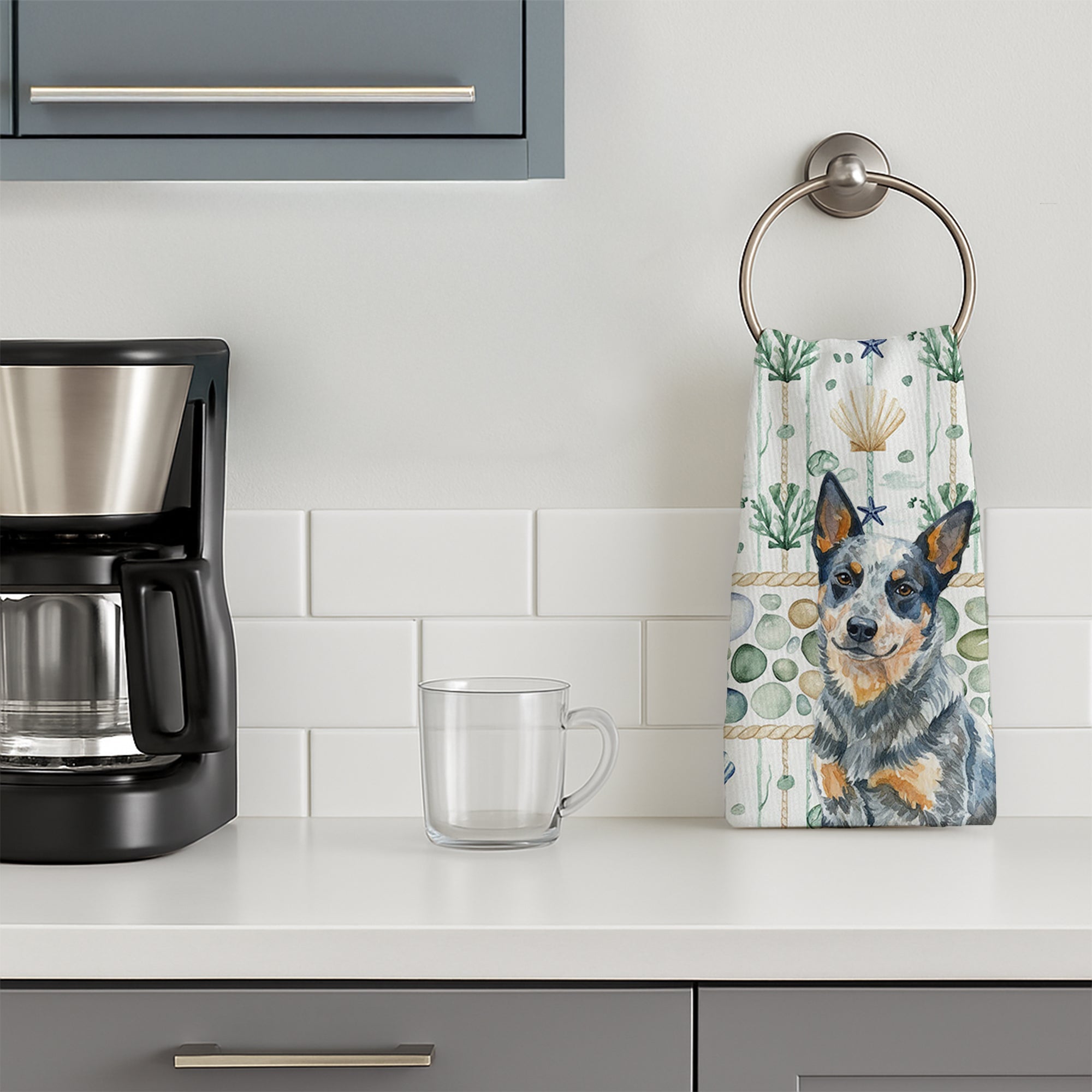 Kitchen Towel featuring breed specific Australian Cattle Dog Blue Heeler artwork. Bring breezy coastal charm to your kitchen or bath with our plush velour towel featuring original watercolor artwork. The soft minky polyester front showcases vivid seashell and starfish designs with a dog portrait, perfect for polishing glassware to a brilliant shine. The 100% cotton terry loop back delivers superior absorbency for drying hands, dishes, or counters. Artwork is dyed directly into the fibers for lasting color that won’t crack or peel. Each towel measures 15" x 25", with bound edges to maintain shape after repeated washes. Machine washable and tumble dry low for easy care. Designed and printed in the USA, these towels combine function and style—ideal for beach homes, coastal kitchens, or as thoughtful gifts.