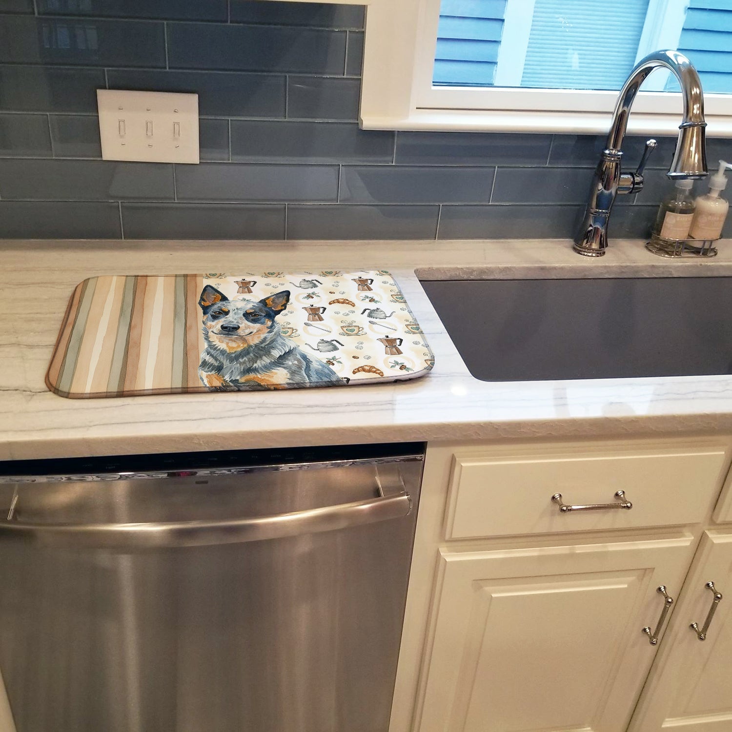 Shown here is the Blue Heeler Australian Cattle Dog Coffee Bar Dish Drying Mat from Caroline's Treasures featuring artwork of a Australian Cattle Dog Blue Heeler in a Everyday design. The detailed illustration and vibrant colors make it a standout accent that celebrates both seasonal style and love for the subject. This image features a cozy watercolor coffee-themed pattern with illustrated mugs, moka pots, kettles, croissants, coffee beans, and sugar cubes arranged in a repeating design. Soft neutral tones with warm browns, creams, and subtle sage accents create an inviting, café-inspired look that feels comforting and relaxed. Everyday décor celebrates personal style and the small moments that make a house feel like home. Thoughtful designs add warmth and personality that can be enjoyed year-round. Say goodbye to messy countertops and soggy dish towels with our innovative dish drying mat. Our high-quality dish drying pad is designed to keep your countertops dry while offering a stylish and efficient solution. Whether you're air drying dishes, glasses, stemware, silverware, pots, pans, bottles, or even fruits and vegetables, our dish mat is the perfect choice. The 14 inches x 21 inches size fits most counters and dish drying racks, and the non-slip design ensures stability. Made with water-absorbent polyester and a polyurethane foam insert, our dish drying mat is not only functional but also durable. It's machine washable and printed in the USA for long-lasting use. The beautiful artwork adds flair to your kitchen decor, making it a perfect housewarming gift or present for any occasion. Upgrade your kitchen experience with our absorbent and versatile dish drying mat. Perfect for: Kitchen counters and sinks, everyday dish drying and countertop protection, Dogs-themed homes, or year-round use for Australian Cattle Dog Blue Heeler lovers. Australian Cattle Dogs, also known as Blue Heelers, are compact and muscular with alert expressions. Their sturdy build reflects intelligence and endurance. Makes a heartfelt gift for: Australian Cattle Dog Blue Heeler owners, Dogs lovers, Everyday gifts, pet parents, friends who adore their Australian Cattle Dog Blue Heeler, or anyone celebrating Dogs.