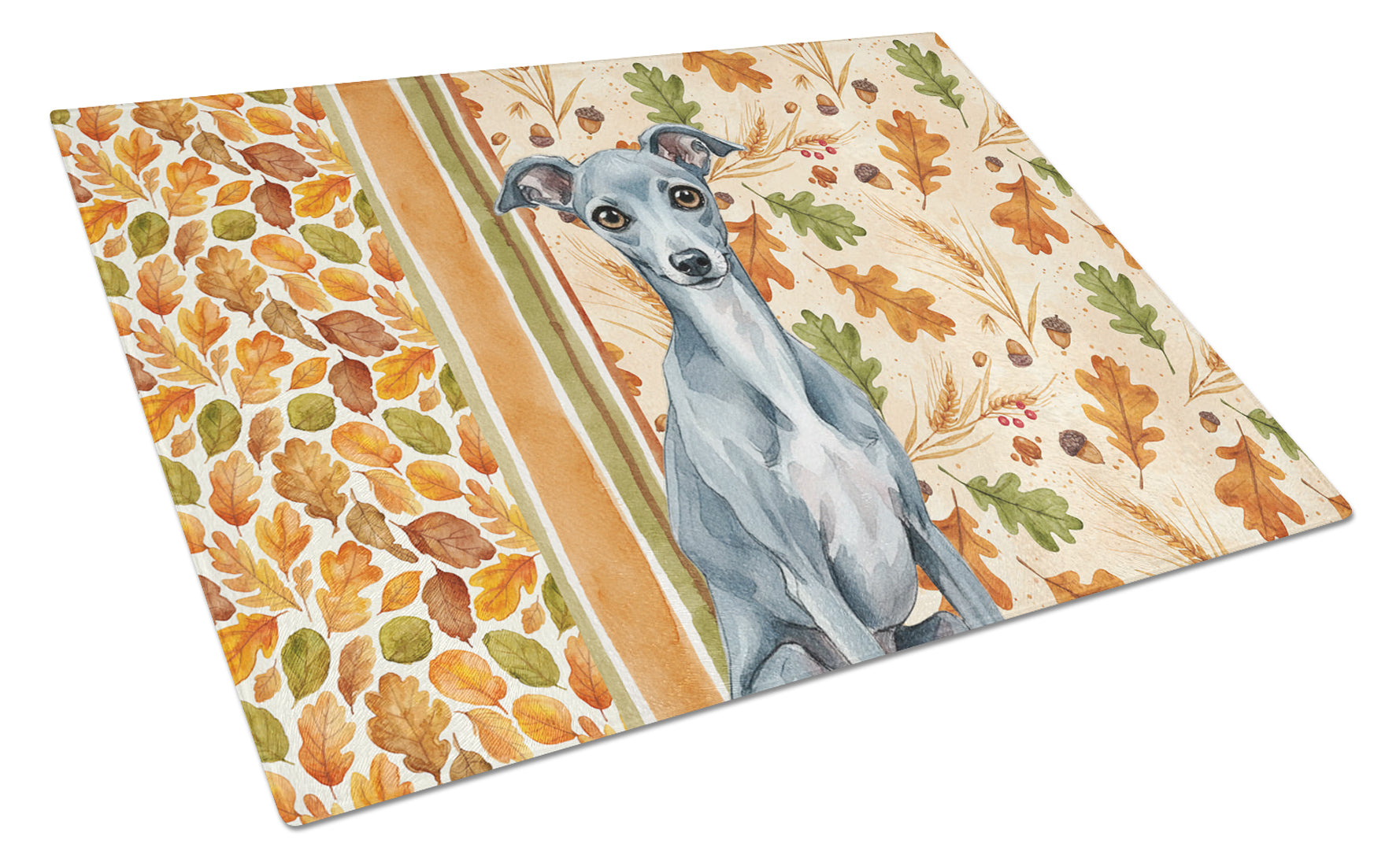 Glass Cutting Board featuring breed specific Italian Greyhound artwork. Celebrate Thanksgiving with this Thanksgiving Cutting Board. Introduce your kitchen to the vibrant, large Decorative Glass Cutting Board from Caroline's Treasures. Crafted from resilient tempered glass, this board is not only a utilitarian necessity but also a colorful art piece. With its generous dimensions of 15 inches in height and 12 inches in length, it offers ample space for all your cutting needs. Every piece showcases captivating artwork from distinguished artists, bringing an aesthetic edge to your kitchen. Beyond its attractive design, this cutting board ensures your countertop stays pristine and unscathed, owing to its heat-resistant properties. Engineered with user convenience in mind, it features non-skid feet for stability, and rounded corners for additional safety. Its robust construction renders it virtually unbreakable, guaranteeing longevity. The board comes with protective feet bumpers, maintaining its position during use. This product is recommended to be hand washed only. Proudly printed and assembled in the United States, this cutting board exemplifies superior craftsmanship. With Caroline's Treasures' Decorative Glass Cutting Board, you're investing in a blend of functionality and artistic flair.