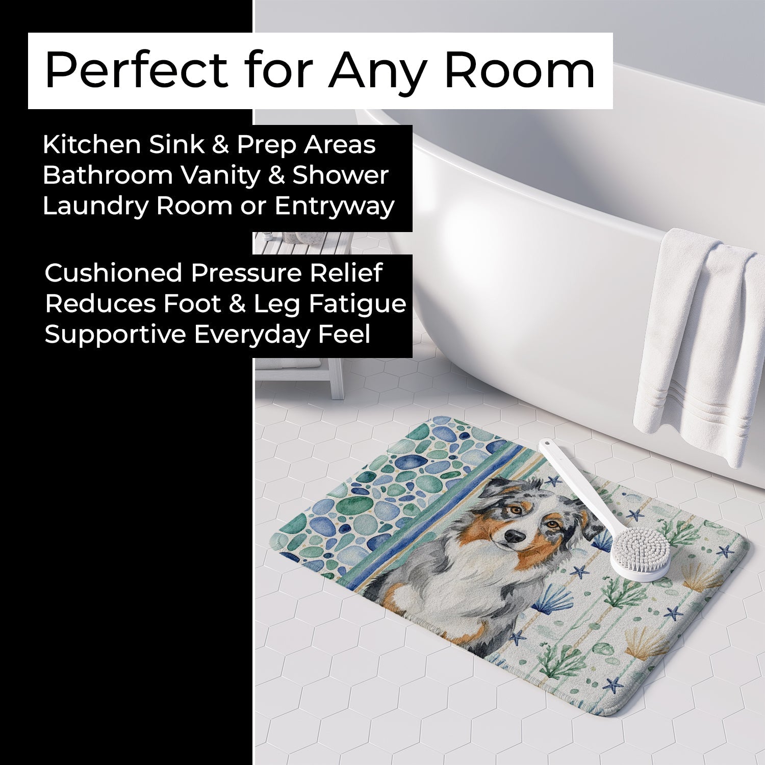 Shown here is the Blue Merle Australian Shepherd Coastal Sea Glass Memory Foam Kitchen Mat from Caroline's Treasures featuring artwork of a Australian Shepherd in a Everyday design. The detailed illustration and vibrant colors make it a standout accent that celebrates both seasonal style and love for the subject. This image features a calming coastal watercolor pattern with soft seashells, seaweed, starfish, and pebble-inspired accents arranged in a repeating design. The soothing palette of blues, greens, and sandy neutrals creates a relaxed, beach-inspired look that adds a fresh and tranquil feel to any space. Everyday décor celebrates personal style and the small moments that make a house feel like home. Thoughtful designs add warmth and personality that can be enjoyed year-round. Transform your floor into a work of art with Caroline's Treasures' Memory Foam Mat. This mat offers not only a stunning visual appeal but also a luxurious, plush feel that's incredibly comfortable to the touch. It's a versatile, machine-washable mat designed for both bath and kitchen use, ensuring you experience the best in comfort and convenience. Care Instructions: Maintaining this memory foam mat is a breeze. Simply follow the care instructions on the product tag. It's recommended to wash in cold water and dry on a low-temperature setting in the dryer. This ensures the mat retains its quality and longevity, allowing you to enjoy its beauty and comfort for a long time. Caroline's Treasures' Memory Foam Mat Machine Washable is the perfect blend of artistry, comfort, and practicality, making it a standout addition to any space. Upgrade your home decor with this versatile and stylish mat today. Australian Shepherds, commonly called Aussies, are highly intelligent, energetic, and loyal dogs. Known for their herding ability and strong bond with owners, this breed is especially loved by active households. Makes a heartfelt gift for: Australian Shepherd owners, Dogs lovers, Everyday gifts, pet parents, friends who adore their Australian Shepherd, or anyone celebrating Dogs.