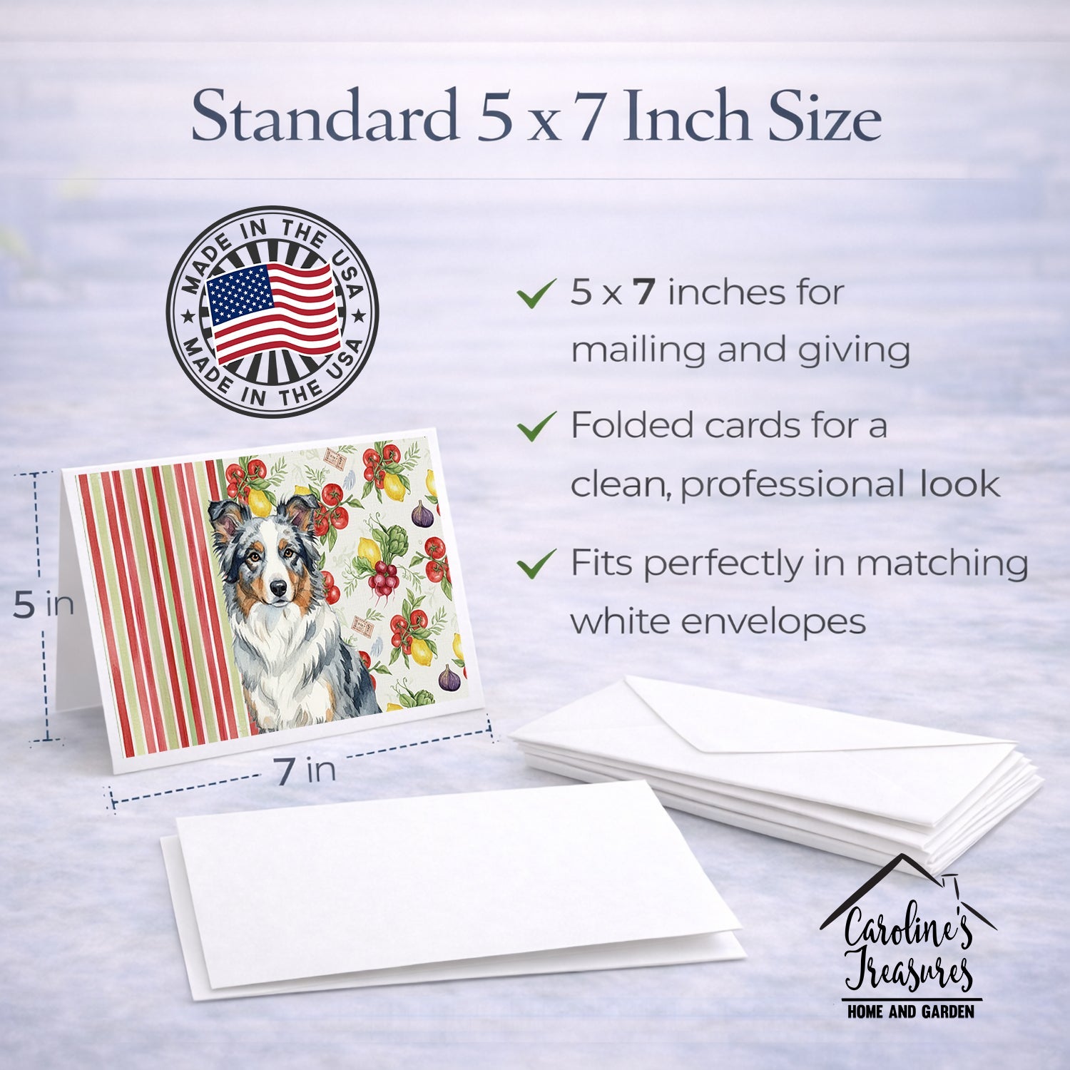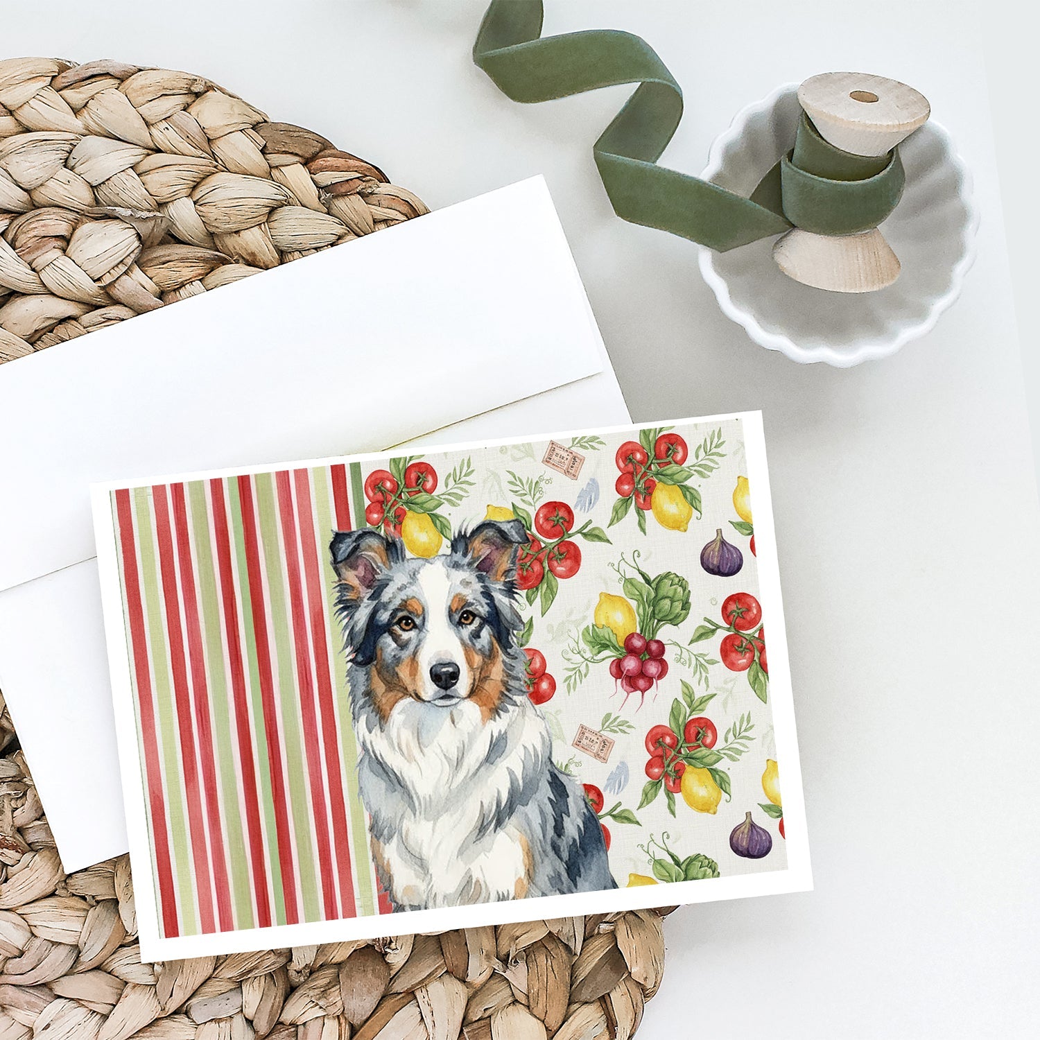 Shown here is the Blue Merle Border Collie Vegetables Greeting Cards Pack of 8 from Caroline's Treasures featuring artwork of a Border Collie in a Everyday design. The detailed illustration and vibrant colors make it a standout accent that celebrates both seasonal style and love for the subject. This image features a vibrant watercolor vegetable pattern with tomatoes, lemons, artichokes, figs, radishes, and leafy greens arranged in a repeating design, paired with classic red and green stripes. The bright, garden-fresh palette creates a cheerful, farmhouse-inspired look that feels lively, welcoming, and perfect for kitchen décor. Everyday décor celebrates personal style and the small moments that make a house feel like home. Thoughtful designs add warmth and personality that can be enjoyed year-round. Celebrate special moments with Caroline's Treasures Printed Greeting Card Pack. This pack includes eight beautifully folded 5x7 cards, accompanied by eight matching white envelopes. With blank interiors, these cards provide ample space for your personalized messages and heartfelt holiday greetings. Each card features captivating full-color artwork, meticulously printed in our facility on high-quality 80 lb cover stock or 216 GSM. The super smooth finish of the white cards enhances the visual impact of the artwork, creating a truly stunning presentation. Designed by our talented in-house artists or licensed artists, the artwork on these cards showcases their creativity and attention to detail. From vibrant illustrations to captivating designs, each card tells its own unique story. Whether it's for birthdays, anniversaries, holidays, or any special occasion, Caroline's Treasures Greeting Card Pack is the perfect way to convey your heartfelt sentiments. Share joy, love, and warm wishes with these exquisite cards and make every moment unforgettable. Perfect for: Writing personal messages, everyday correspondence, and thoughtful notes, Dogs-themed stationery collections, or year-round use for Border Collie lovers. Border Collies are highly intelligent herding dogs known for their focus and agility. Often considered one of the smartest breeds, they excel at problem-solving and thrive on activity. Makes a heartfelt gift for: Border Collie owners, Dogs lovers, Everyday gifts, pet parents, friends who adore their Border Collie, or anyone celebrating Dogs.