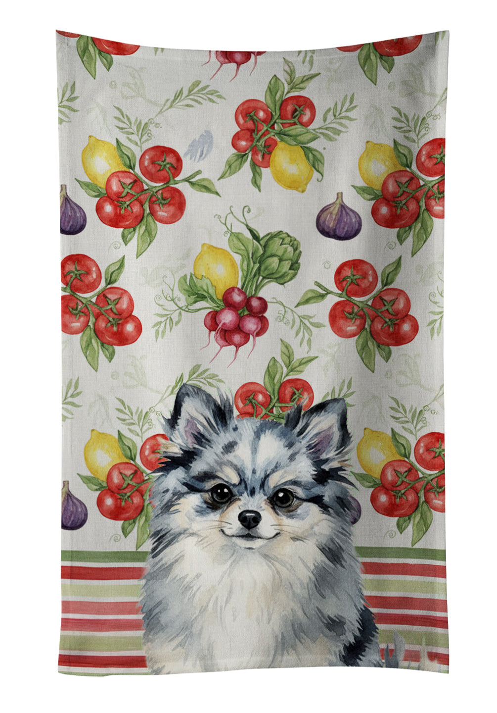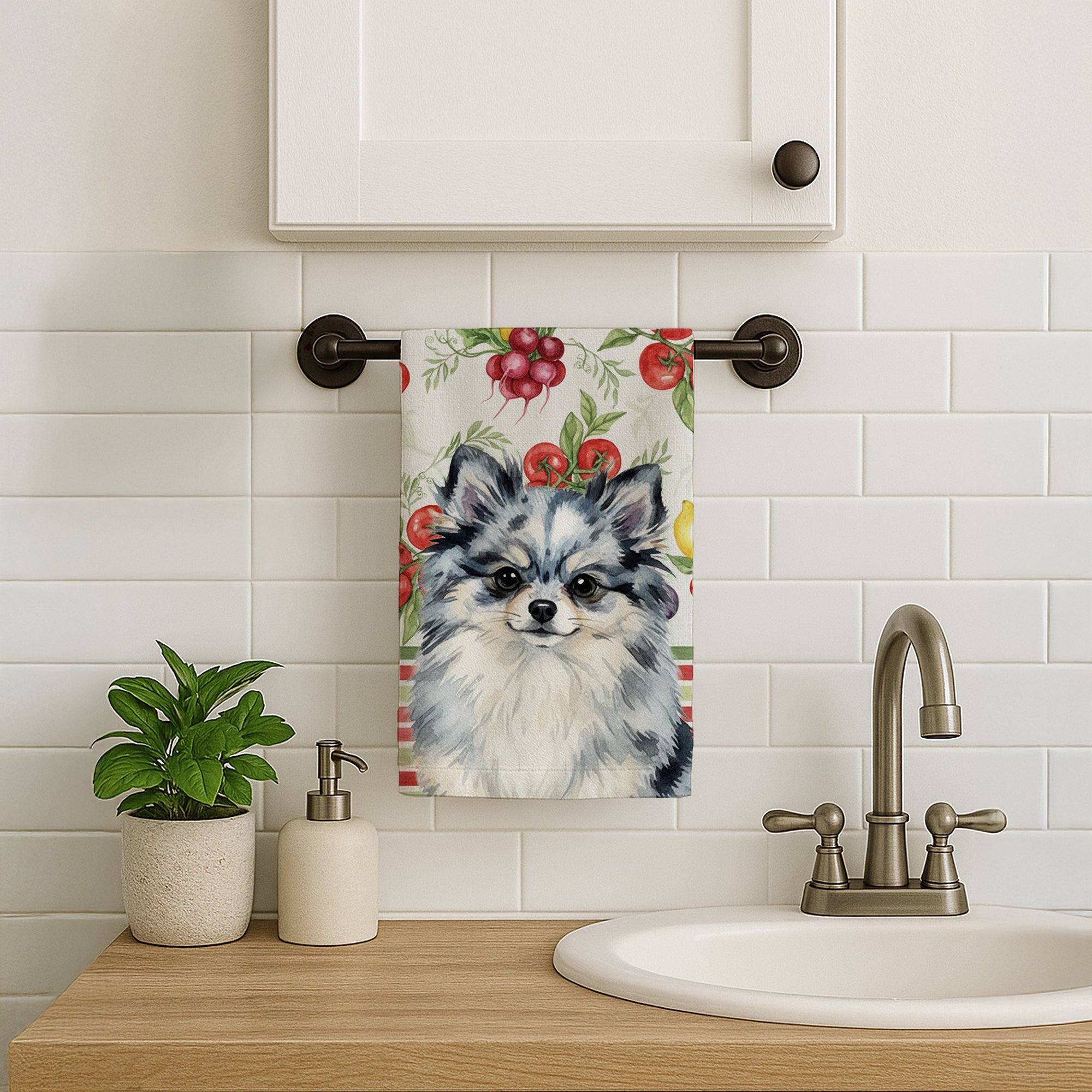 Shown here is the Blue Merle Pomeranian Vegetables Kitchen Towel from Caroline's Treasures featuring artwork of a Pomeranian in a Everyday design. The detailed illustration and vibrant colors make it a standout accent that celebrates both seasonal style and love for the subject. This image features a vibrant watercolor vegetable pattern with tomatoes, lemons, artichokes, figs, radishes, and leafy greens arranged in a repeating design, paired with classic red and green stripes. The bright, garden-fresh palette creates a cheerful, farmhouse-inspired look that feels lively, welcoming, and perfect for kitchen décor. Everyday décor celebrates personal style and the small moments that make a house feel like home. Thoughtful designs add warmth and personality that can be enjoyed year-round. Bring cozy everyday charm to your sink or powder room with a plush velour towel featuring original watercolor artwork. The front is a soft, color-rich minky polyester that polishes glassware to a brilliant shine; the back is 100% white cotton terry loop for quick absorbency on hands, dishes, and counters. Artwork is dyed into the fibers for lasting color that won’t crack or peel. Finished edges keep the shape wash after wash. Size: 15" x 25". Machine wash; tumble dry low. Designed and printed in the USA. Perfect for: Kitchen counters, ovens, and towel bars, everyday drying and cleanup, -themed kitchens, or year-round use for Pomeranian lovers. Pomeranians are small companion dogs known for their fluffy coats and lively personality. This breed is cherished for its confidence, intelligence, and affectionate nature. Makes a heartfelt gift for: Pomeranian owners, lovers, Everyday gifts, pet parents, friends who adore their Pomeranian, or anyone celebrating .