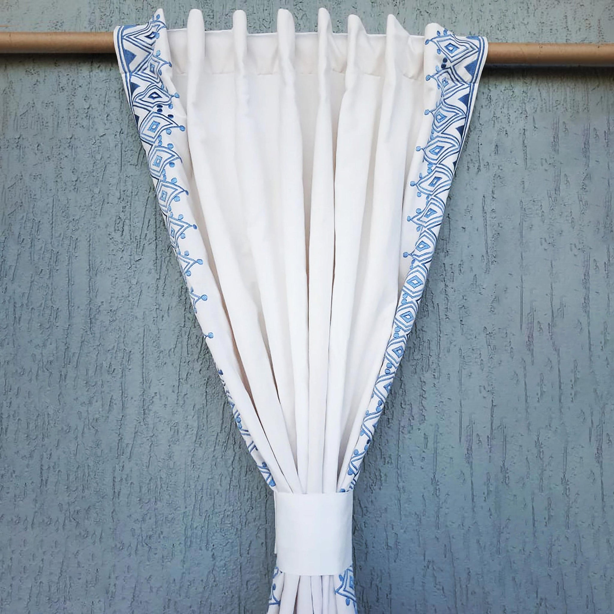 These blue Moroccan design embroidery curtains are a perfect addition to your décor to give a Mediterranean look. This geometric linen curtain panel is with Moroccan design- eye element. This makes it very special addition to every décor from living room to bedroom to office décor.