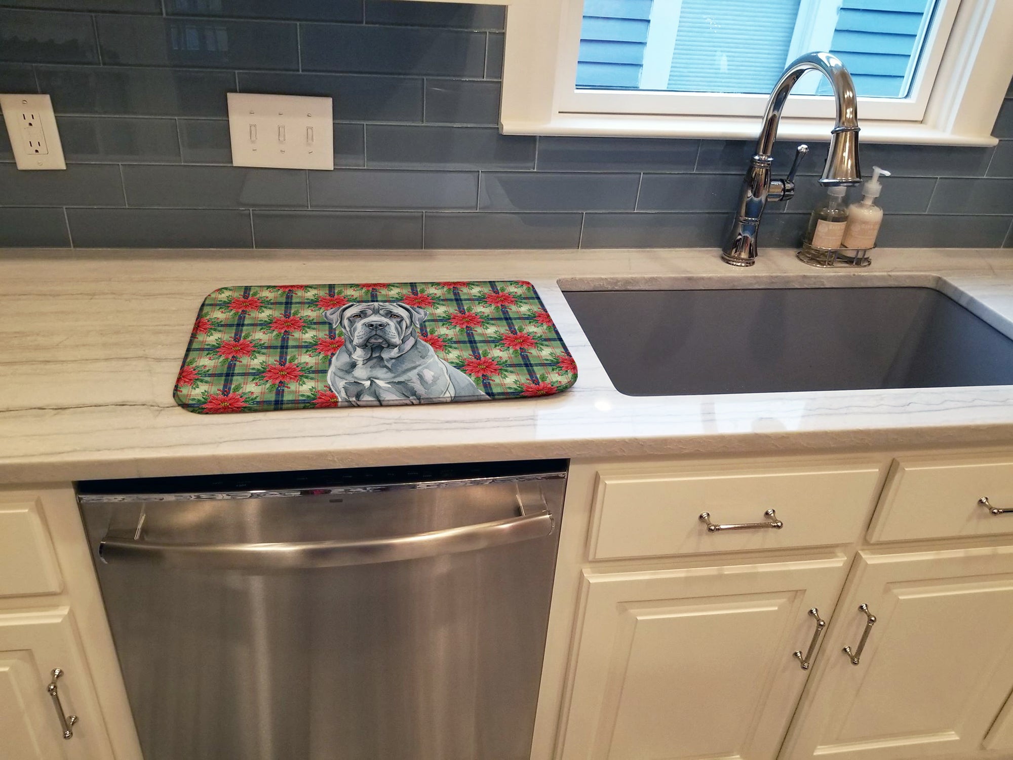 Dish Drying Mat featuring breed specific Neapolitan Mastiff artwork. Celebrate Christmas with this Christmas Dish Drying Mat. Say goodbye to messy countertops and soggy dish towels with our innovative dish drying mat. Our high-quality dish drying pad is designed to keep your countertops dry while offering a stylish and efficient solution. Whether you're air drying dishes, glasses, stemware, silverware, pots, pans, bottles, or even fruits and vegetables, our dish mat is the perfect choice. The 14 inches x 22 inches size fits most counters and dish drying racks, and the non-slip design ensures stability. Made with water-absorbent polyester and a polyurethane foam insert, our dish drying mat is not only functional but also durable. It's machine washable and printed in the USA for long-lasting use. The beautiful artwork adds flair to your kitchen decor, making it a perfect housewarming gift or present for any occasion. Upgrade your kitchen experience with our absorbent and versatile dish drying mat.