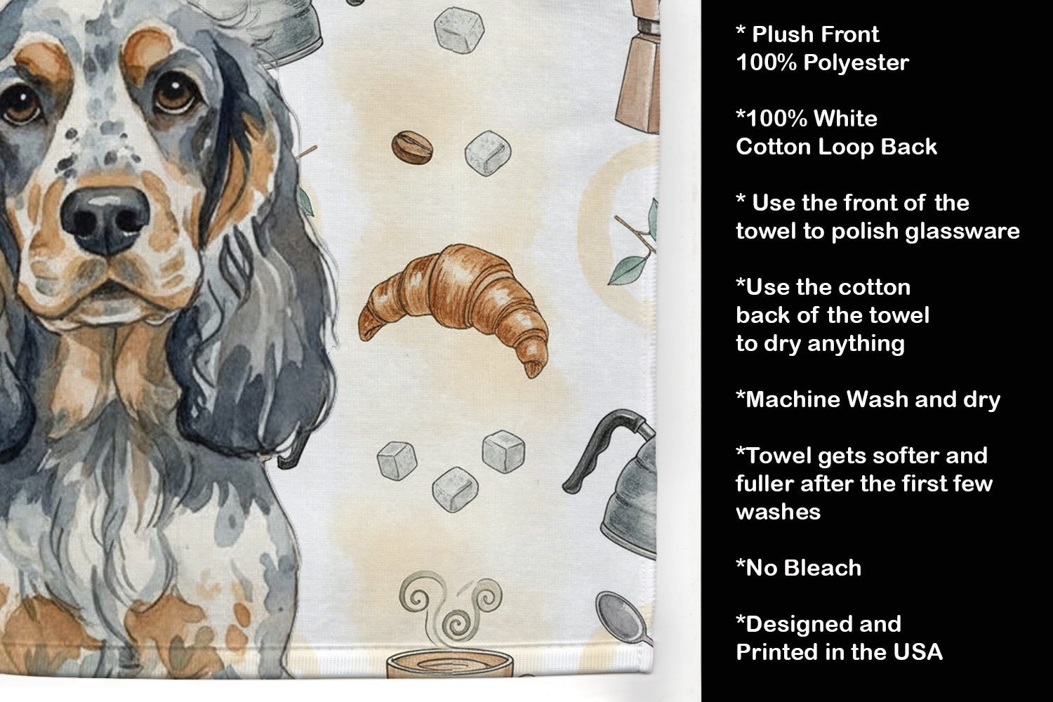 Kitchen Towel featuring breed specific English Cocker Spaniel artwork. Start your morning with charm and function thanks to our Coffee Time Kitchen Towel Collection. Featuring playful watercolor artwork of coffee pots, cups, croissants, and a dog portrait, these towels bring warmth and personality to your kitchen or bath. Crafted with a plush minky polyester front that polishes glassware to a shine, and a 100% cotton terry loop back for absorbency, they combine durability with practicality. Artwork is permanently dyed into the fibers to keep colors fresh wash after wash. Measuring 15" x 25", these machine-washable towels are finished with bound edges to hold their shape. Designed and printed in the USA, they’re perfect for kitchens, coffee bars, guest baths, or as thoughtful gifts for dog lovers and coffee enthusiasts alike.