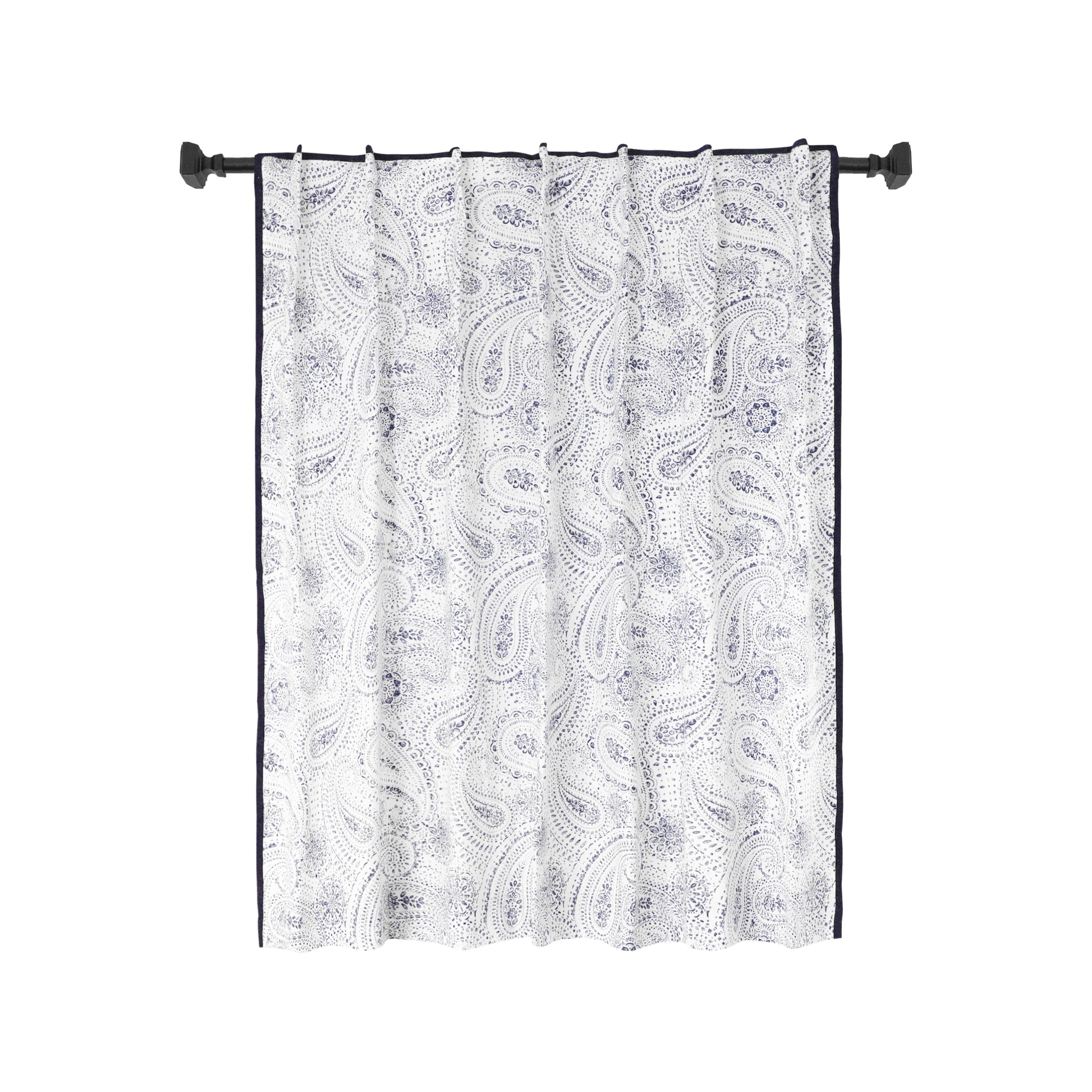 Custom made blended cotton curtain with paisley pattern. These doors and windows curtain are finished with a navy blue decorative trim on three sides. The curtain and drape comes with a cotton lining (for light filtering look) and blackout lining is available at extra cost. The curtains can me custom made to size and color of your choice.