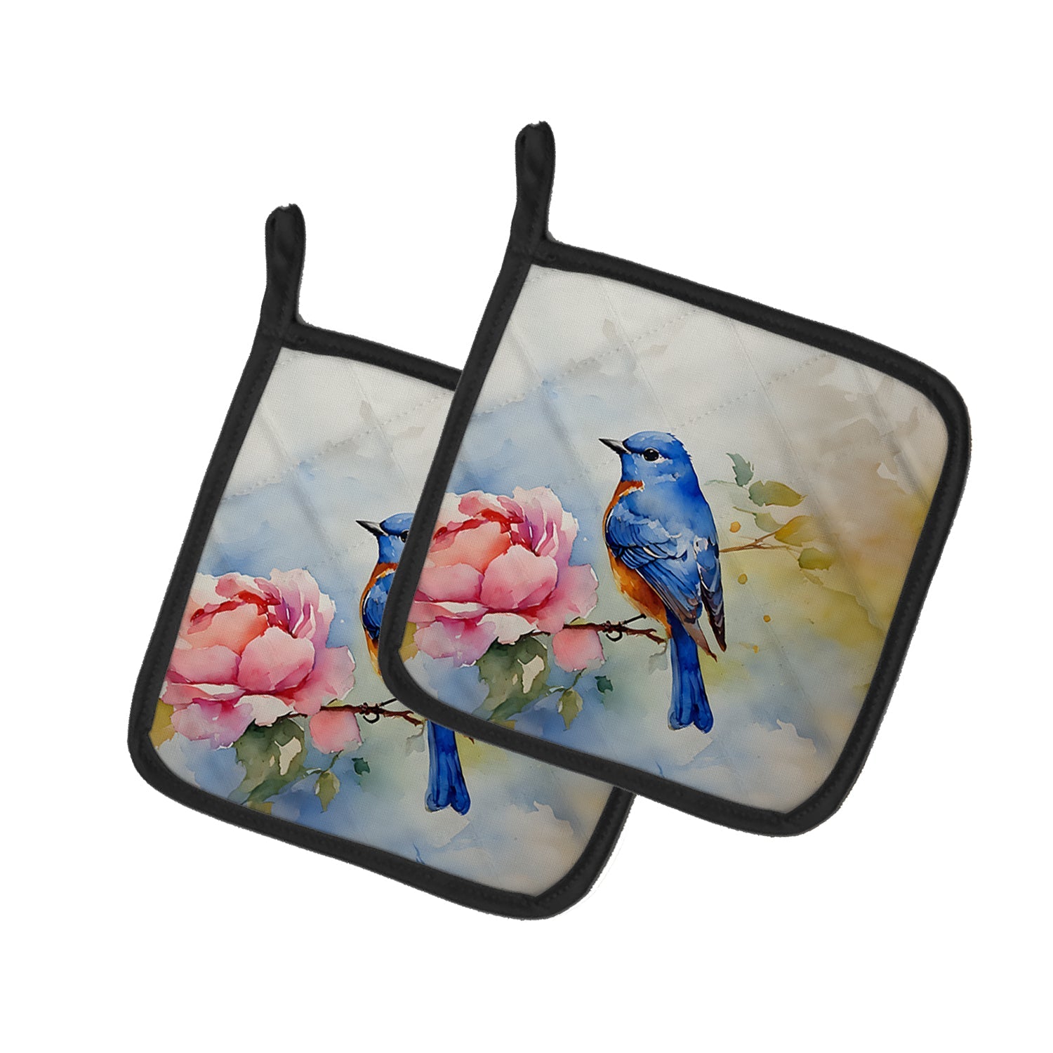 Pair of Pot Holders featuring breed specific Bluebird artwork. A Pair of Pot Holders to match your kitchen decor. Made in the USA these are thick and functional. Full color artwork decorates the front polyester fabric of the hot pad and accented by a black trim. Use these at as a trivet for your Thanksgiving or Christmas tablescape. Filled with insulated fabric and quilted for durability. These colorful pot holders will make a great gift for your favorite home cook or executive chef. Each pot holder measures approximately 7 1/2 inches by 7 1/2 inches. A hanging tab is included.
